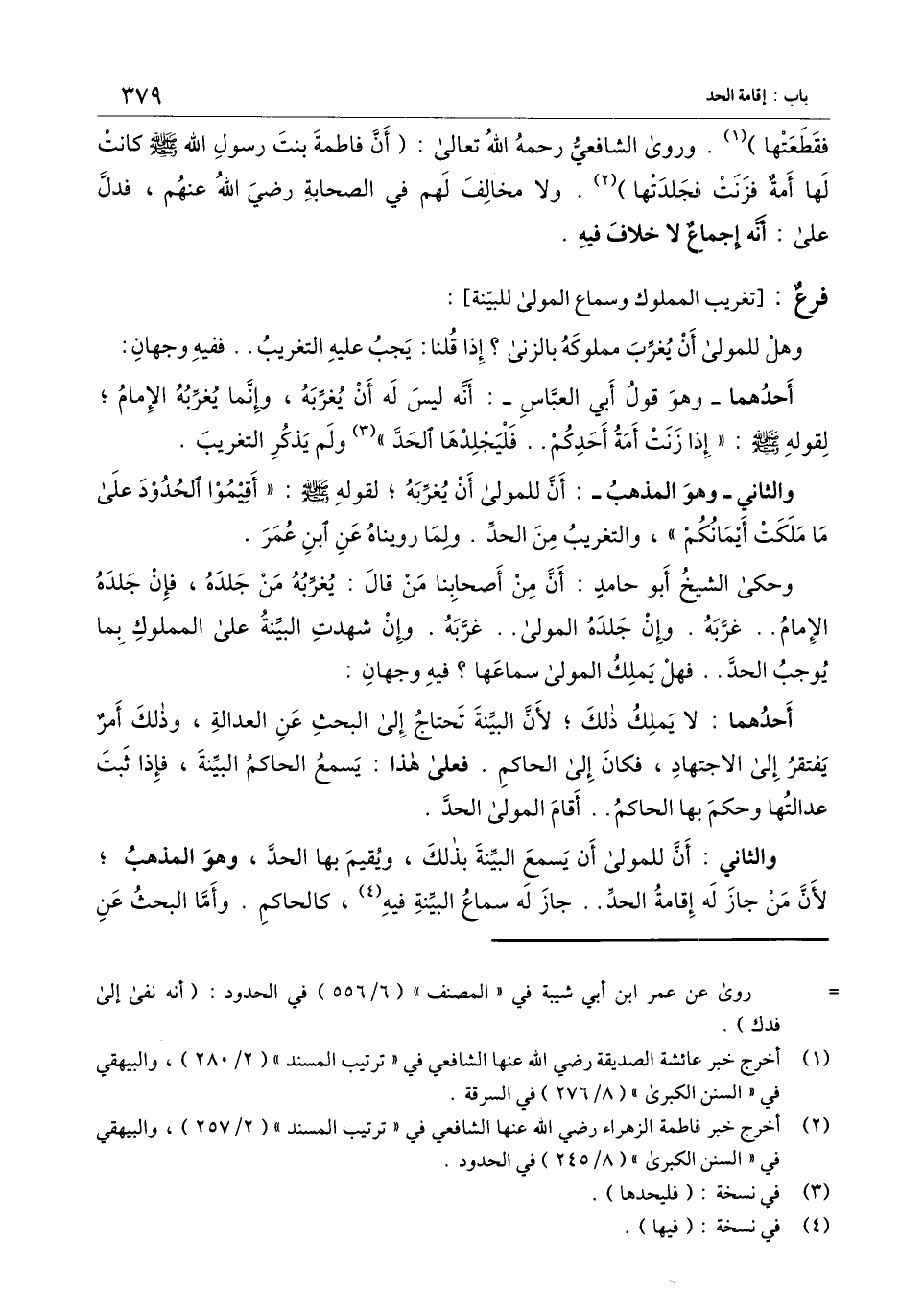 فقطعتها) . ورَوَى الشافعيُّ، - رَحِمَهُ اللَّهُ تَعَالَى -: (أن فاطمة بنت رسول الله - صَلَّى اللَّهُ عَلَيْهِ وَسَلَّمَ - كانت لها أمة فزنت فجلدتها) . ولا مخالف لهم في الصحابة - رَضِيَ اللَّهُ عَنْهُمْ -، فدل على: أنه إجماع لا خلاف فيه.