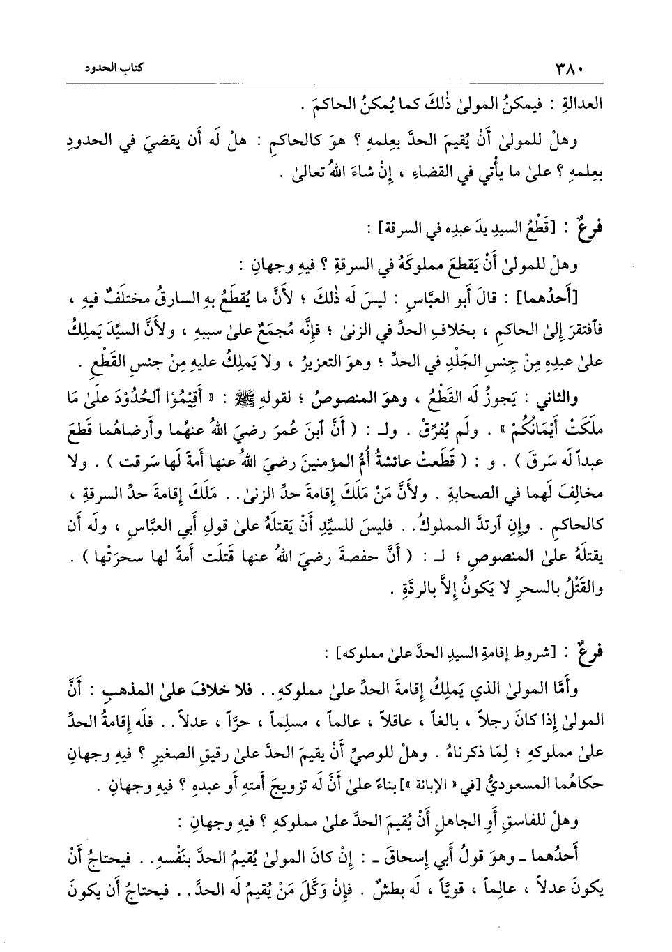 [أحدهما] : قال أبُو العباس: ليس له ذلك؛ لأن ما يقطع به السارق مختلف فيه، فافتقر إلى الحاكم، بخلاف الحد في الزِّنَى؛ فإنه مجمع على سببه، ولأن السيد يملك على عبده من جنس الجلد في الحد؛ وهو التَّعزِير، ولا يملك عليه من جنس القطع.