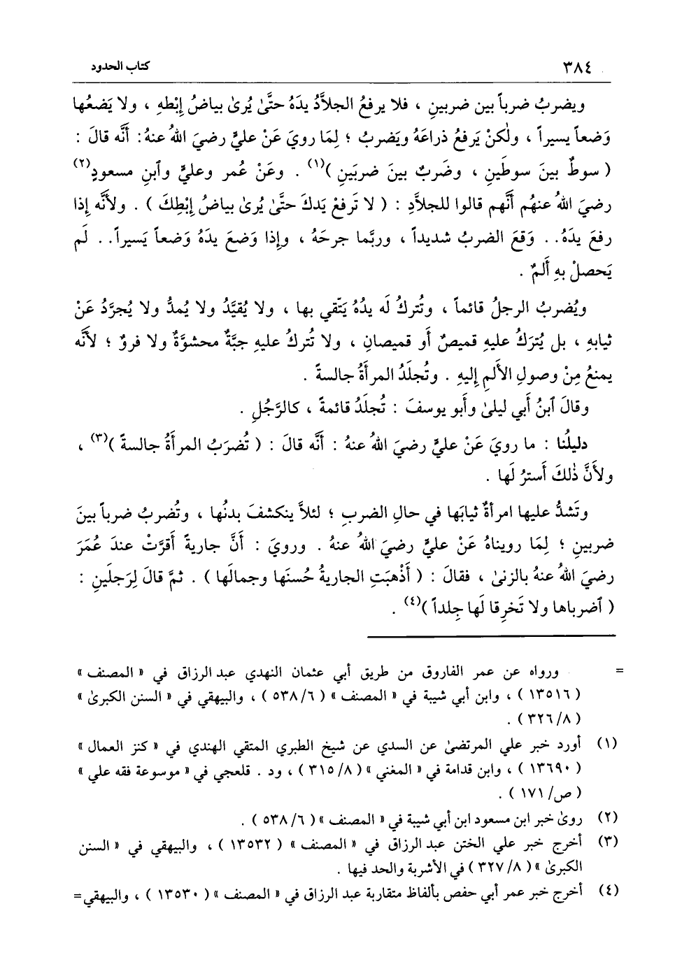 ويضرب ضربا بين ضربين، فلا يرفع الجلاد يده حتى يرى بياض إبطه، ولا يضعها وضعا يسيرا، ولكن يرفع ذراعه ويضرب؛ لما رُوِي عن علي - رَضِيَ اللَّهُ عَنْهُ -: أنه قال: (سوط بين سوطين، وضرب بين ضربين) . وعن عمر وعلي وابن مَسعُودٍ، - رَضِيَ اللَّهُ عَنْهُمْ -، أنهم قالوا للجلاد: (لا ترفع يدك حتى يرى بياض إبطك) . ولأنه إذا رفع يده.. وقع الضرب شديدا، وربما جرحه، وإذا وضع يده وضعا يسيرا.. لم يحصل به الألم.