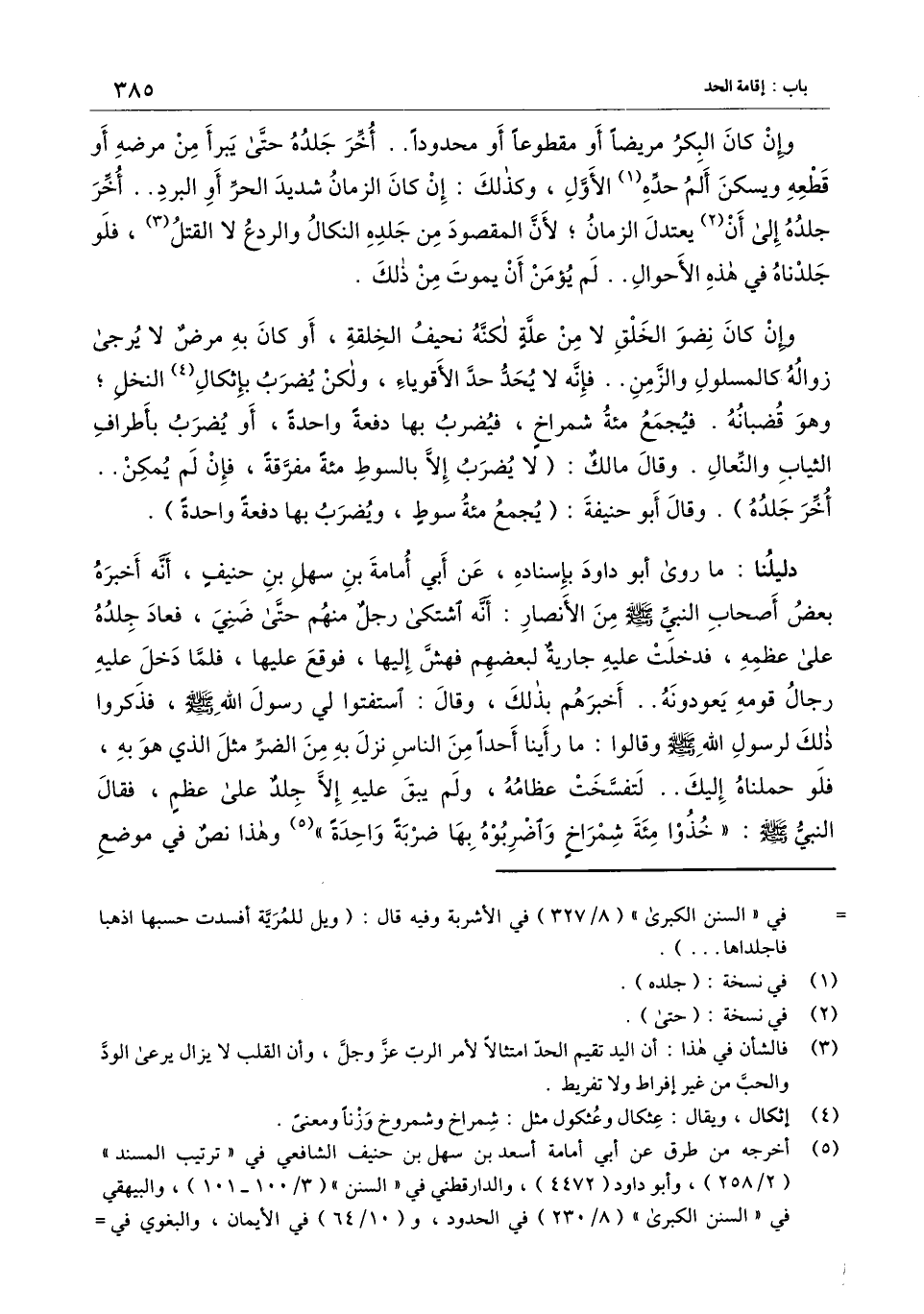 وإن كان نضو الخلق لا من علة لكنه نحيف الخلقة، أو كان به مرض لا يرجى زواله كالمسلول والزمن.. فإنه لا يحد حد الأقوياء، ولكن يضرب بإثكال النخل؛ وهو قضبانه. فيجمع مائة شمراخ، فيضرب بها دفعة واحدة، أو يضرب بأطراف الثياب والنعال. وقال مالك: (لا يضرب إلا بالسوط مائة مفرقة، فإن لم يمكن.. أخر جلده) . وقال أبُو حَنِيفَة: (يجمع مائة سوط، ويضرب بها دفعة واحدة) .