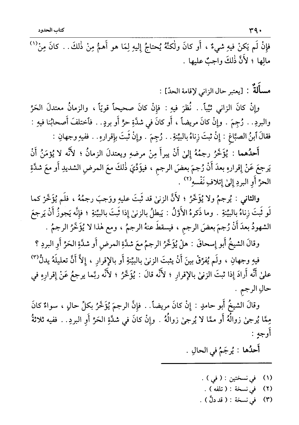 وقال الشيخُ أبُو حامد: إن كان مريضا.. فإن الرجم يؤخر بكل حال، سواء كان مما يرجى زواله أو مما لا يرجى زواله. وإن كان في شدة الحر أو البرد.. ففيه ثلاثة أوجه: