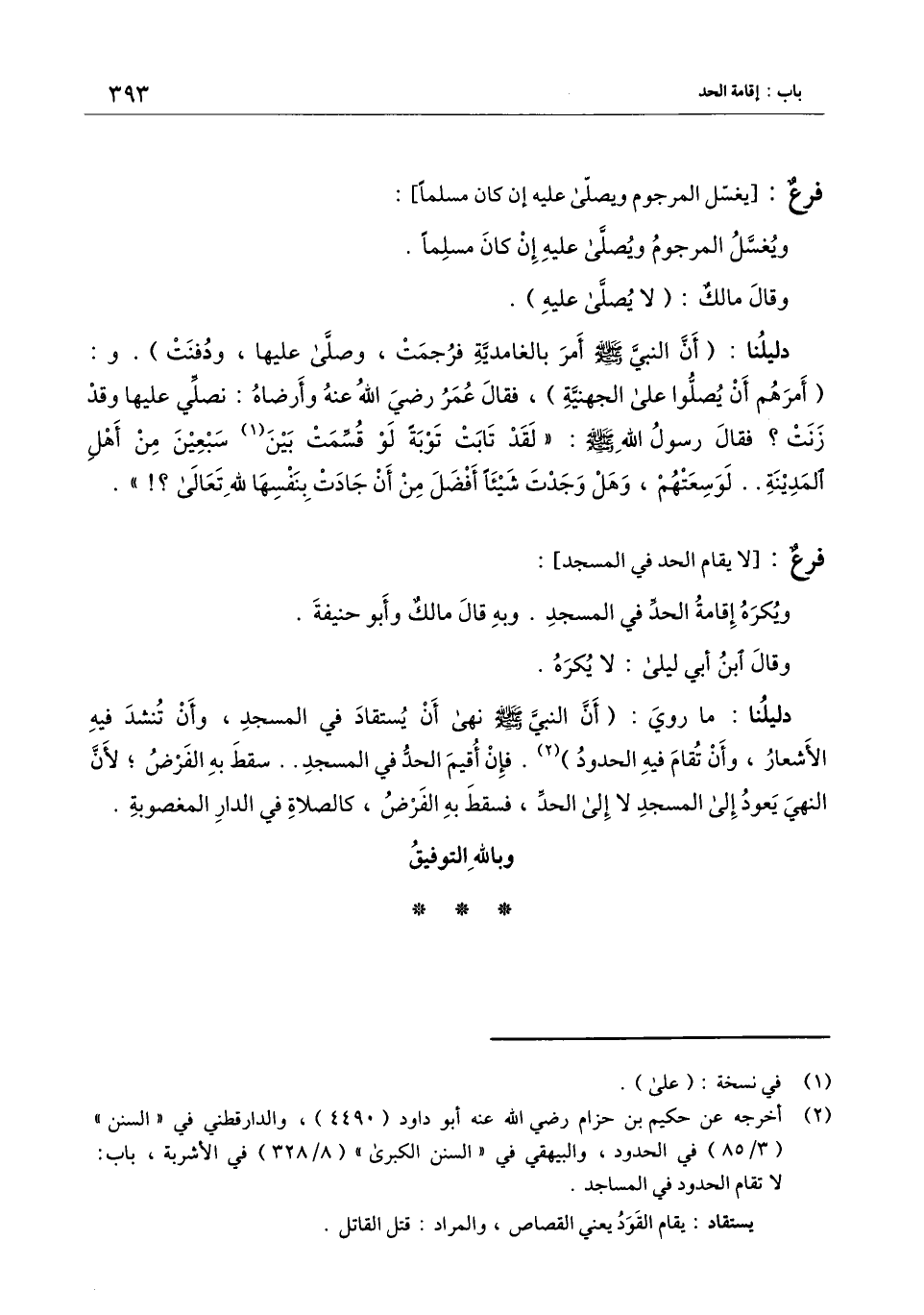 دليلنا: ما رُوِيَ «أن النَّبيَّ - صَلَّى اللَّهُ عَلَيْهِ وَسَلَّمَ - نهى أن يستقاد في المسجد، وأن تنشد فيه الأشعار، وأن تقام فيه الحدود» . فإن أقيم الحد في المسجد.. سقط به الفرض؛ لأن النهي يعود إلى المسجد لا إلى الحد، فسقط به الفرض، كالصلاة في الدار المغصوبة.