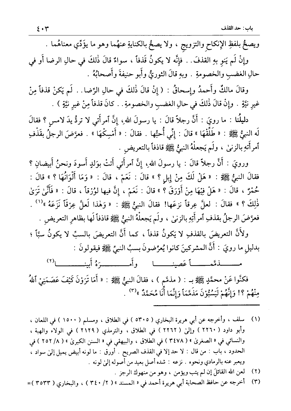 ولأن التعريض بالقذف لا يكون قذفاً، كما أن التعريض بالسب لا يكون سباً، بدليل ما رُوِيَ: أن المشركين كانوا يعرضون بسب النَّبيّ - صَلَّى اللَّهُ عَلَيْهِ وَسَلَّمَ - فيقولون: