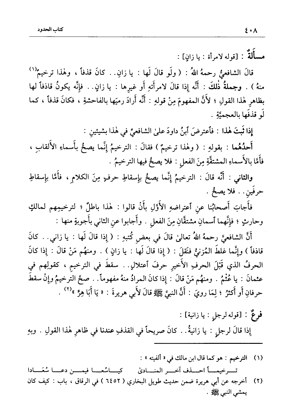 أن الشافعيَّ، - رَحِمَهُ اللَّهُ تَعَالَى - قال في بعض كتبه: (إذا قال لها: يا زاني.. كان قاذفاً) وإنما غلط المزني فنقل: (إذا قال لها: يا زان) . ومنهم من قال: إذا كان الحرف الذي قبل الحرف الأخير حرف اعتلال.. سقط في الترخيم، كقولهم في عُثمانَ: يا عثم. ومنهم من قال: إذا كان المراد منه مفهوماً.. صح الترخيم وإن سقط حرفان أو أكثر، لما رُوِيَ: «أن النَّبيَّ - صَلَّى اللَّهُ عَلَيْهِ وَسَلَّمَ - قال: لأبي هُرَيرَة: "يا أبا هر» .