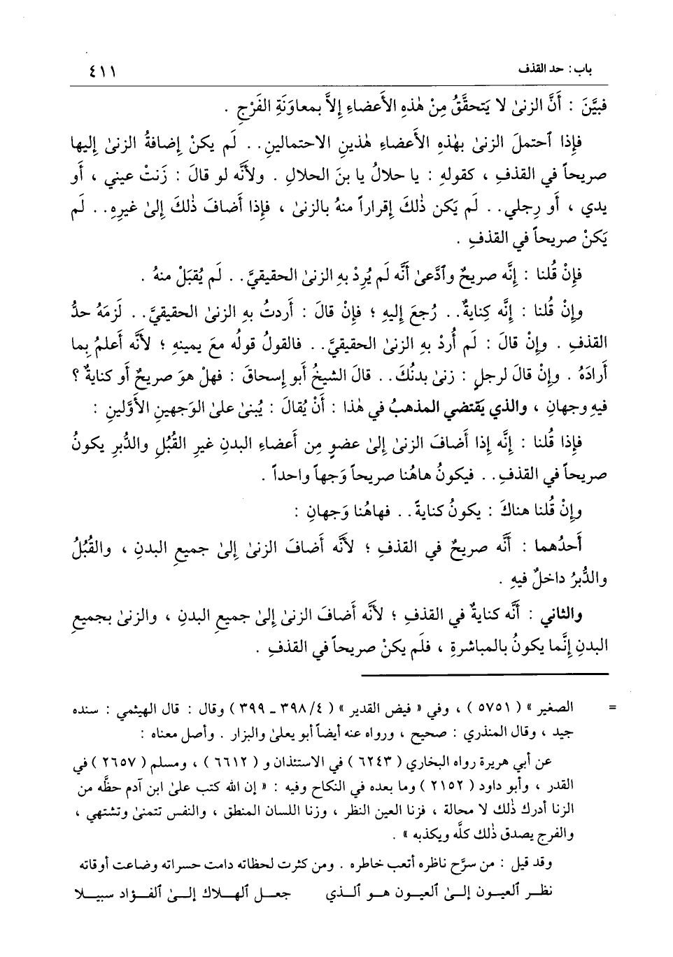 فإذا احتمل الزِّنَى بهذه الأعضاء هذين الاحتمالين.. لم يكن إضافة الزِّنَى إليها صريحاًَ في القذف، كقوله: يا حلال يا ابن الحلال، ولأنه لو قال: زنت عيني، أو يدي، أو رجلي.. لم يكن ذلك إقراراً منه بالزِّنَى، فإذا أضاف ذلك إلى غيره.. لم يكن صريحاً في القذف.
