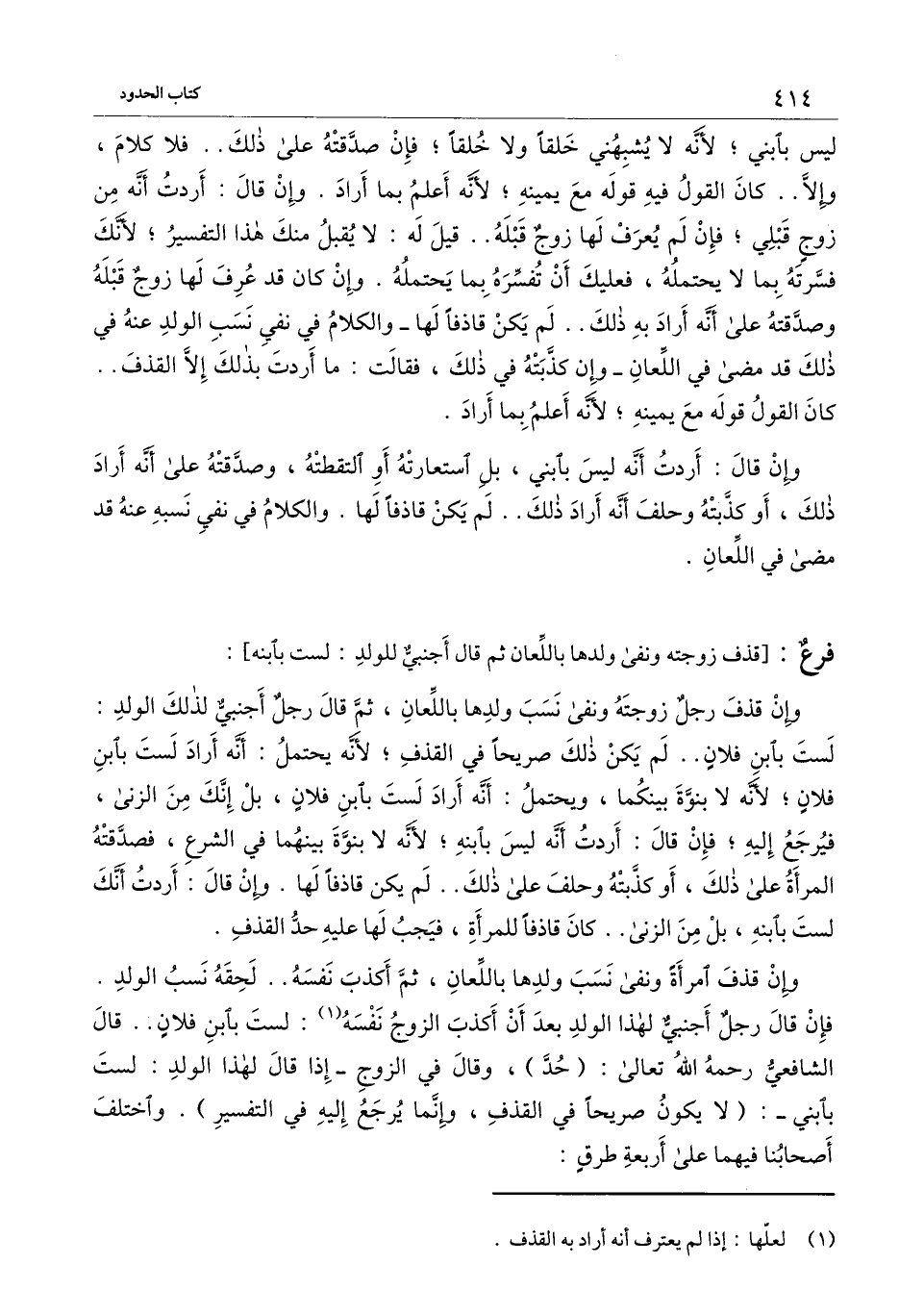 وإن قذف رجل زوجته ونفى نسب ولدها باللعان، ثم قال رجل أجنبي لذلك الولد: لست بابن فلان.. لم يكن ذلك صريحاً في القذف، لأنه يحتمل: أنه أراد لست بابن فلان، لأنه لا بنوة بينكما، ويحتمل: أنه أراد لست بابن فلان، بل إنك من الزِّنَى، فيرجع إليه، فإن قال: أردت أنه ليس بابنه، لأنه لا بنوة بينهما في الشَّرع، فصدقته المرأة على ذلك، أو كذبته وحلف على ذلك.. لم يكن قاذفاً لها. وإن قال: أرد أنك لست بابنه، بل من الزِّنَى.. كان قاذفاً للمرأة، فيجب لها عليه حد القذف.
