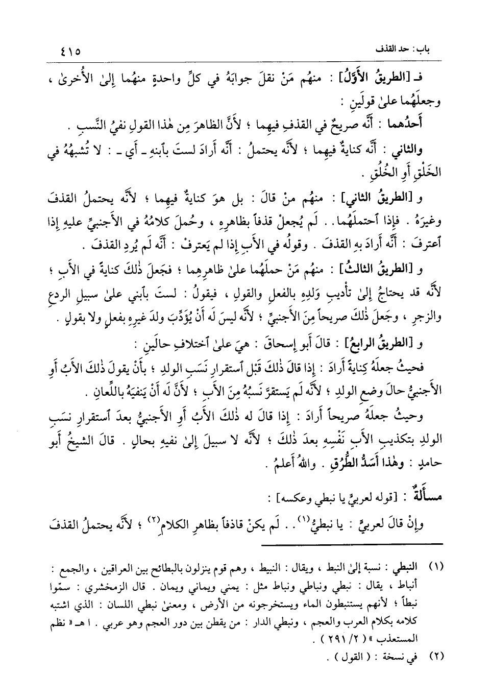 وإن قال لعربي: يا نبطي.. لم يكن قاذفا بظاهر الكلام، لأنه يحتمل القذف
