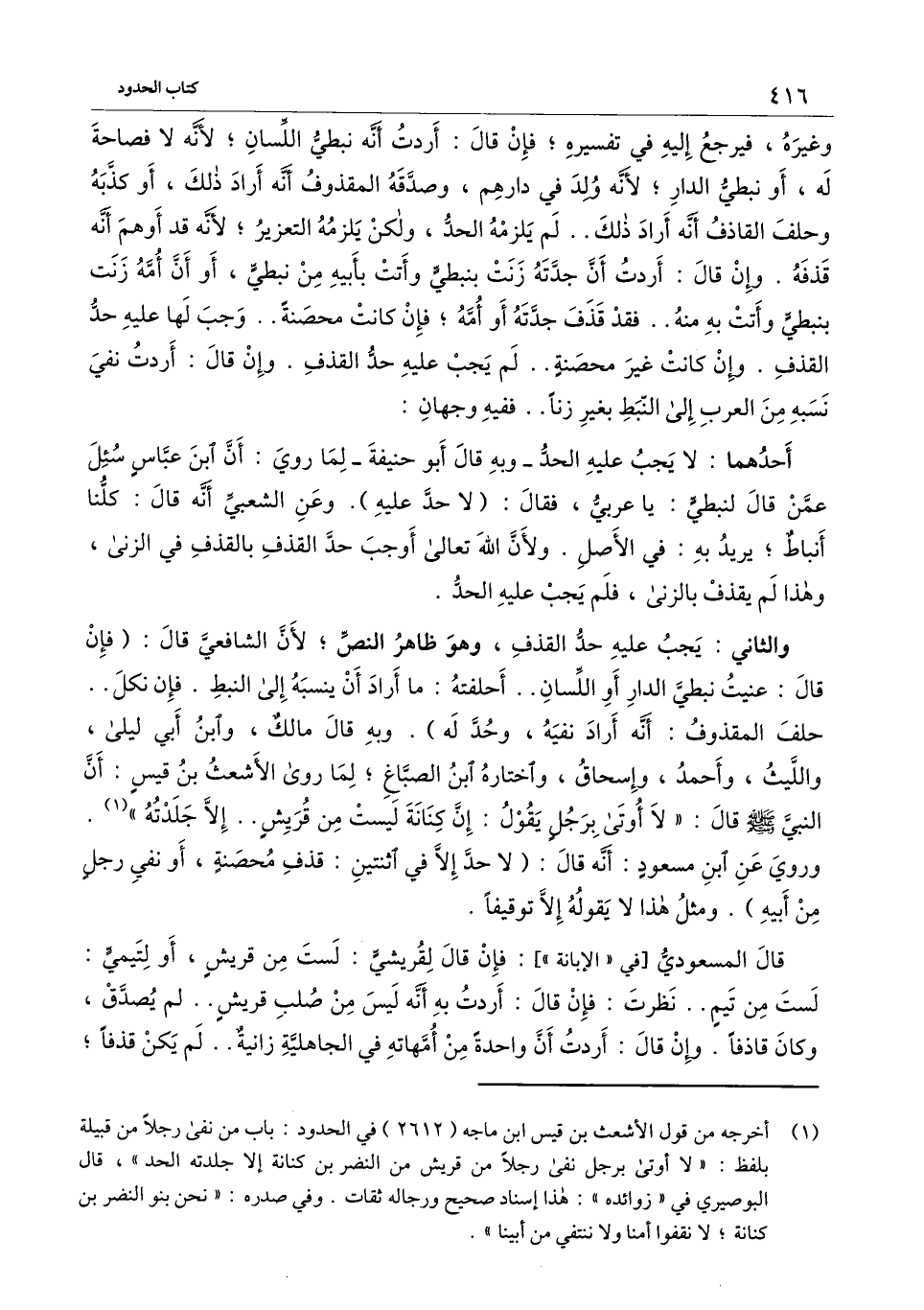 والثاني: يجب عليه حد القذف، وهو ظاهر النص، لأن الشافعيَّ، قال: (فإن قال: عنيت نبطي الدار أو اللسان.. أحلفته: ما أراد أن ينسبة إلى النبط. فإن نكل.. حلف المقذوف: أنه أراد نفيه، وحد له) . وبه قال مالك، وابن أبي ليلى، والليث، وأحمد، وإسحاق، واختاره ابن الصبَّاغ، لما رَوَى الأشعث بن قيس: أن النَّبيَّ - صَلَّى اللَّهُ عَلَيْهِ وَسَلَّمَ - قال: «لا أوتى برجل يقول: إن كنانة ليست من قريش.. ألا جلدته»