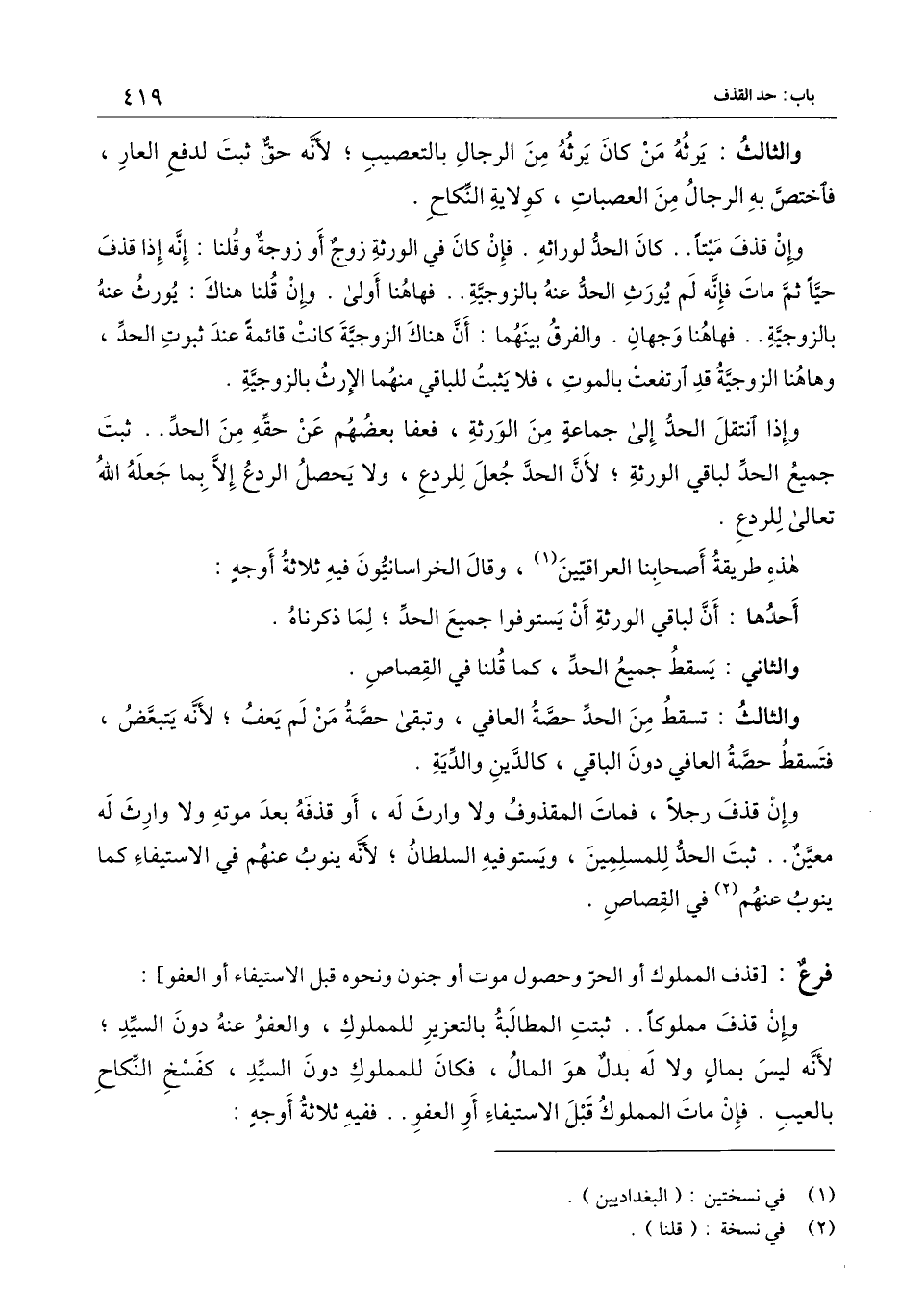 ] : وإن قذف مملوكا.. ثبتت المطالبة بالتَّعزِير للمملوك، والعفو عنه دون السيد، لأنه ليس بمال ولا له بدَّل هو المال، فكان للمملوك دون السيد، كفسخ النكاح بالعيب، فإن مات المملوك قبل الاستيفاء أو العفو.. ففيه ثلاثة أوجه: