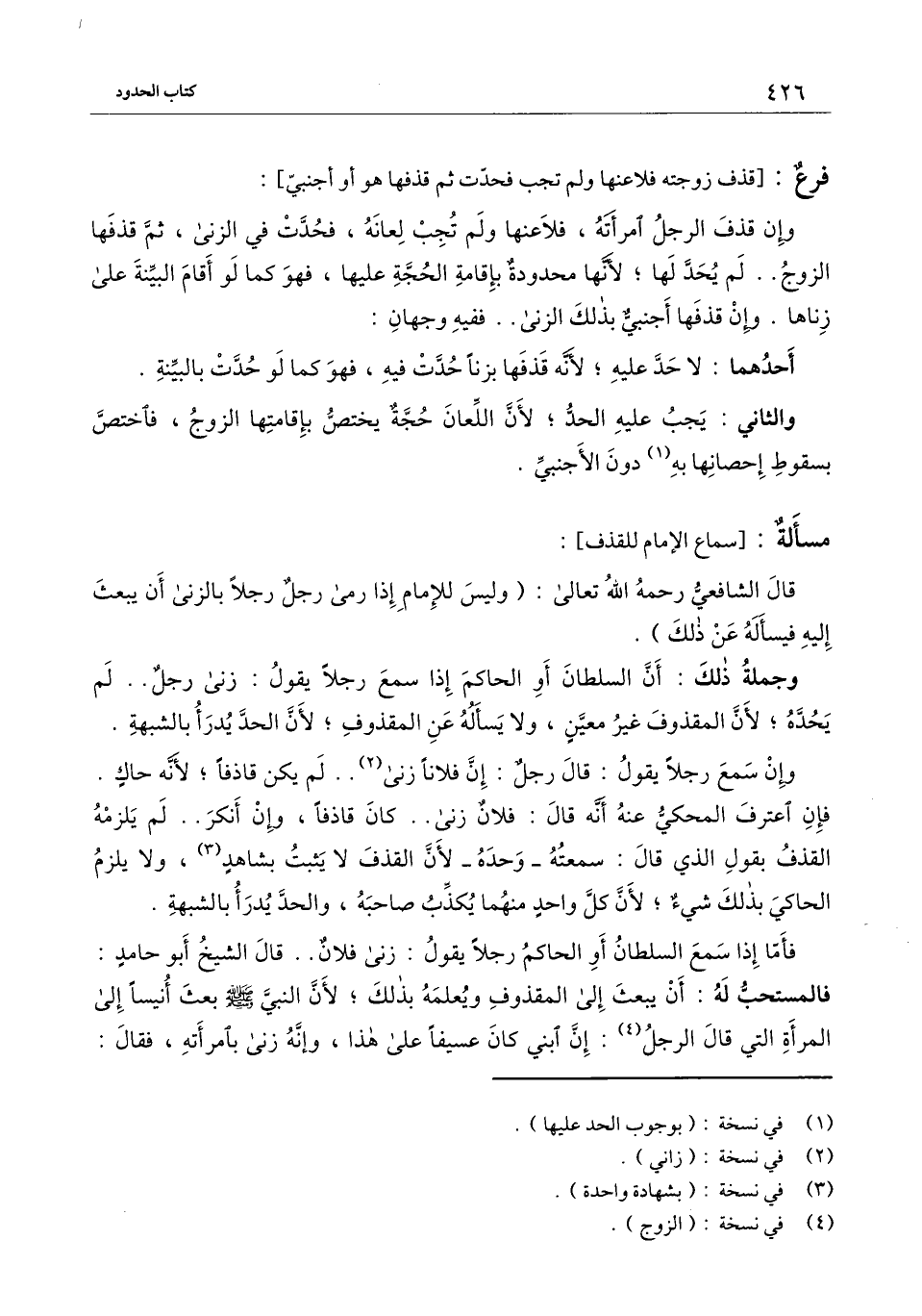 فأما إذا سمع السلطان أو الحاكم رجلا يقول: زني فلان.. قال الشيخُ أبُو حامد المستحب له: أن يبعث على المقذوف ويعلمه بذلك، لأن النَّبيَّ - صَلَّى اللَّهُ عَلَيْهِ وَسَلَّمَ - بعث أنيسا إلى المرأة التي قال: الرجل إن ابني كان عسيفا على هذا وإنه زني بامرأته، فقال: