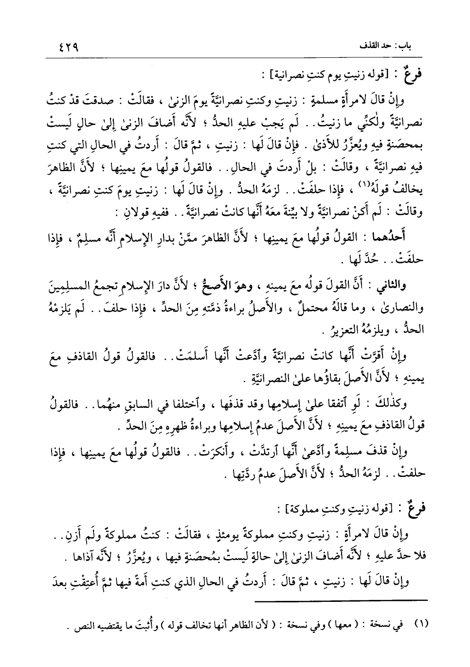وإن قال لامرأة مسلمة: زنيت وكنت نصرانية يوم الزِّنَى، فقالت: صدقت قد كنت نصرانية ولكني ما زنيت.. لم يجب عليه الحد، لأنه أضاف الزِّنَى إلى حال ليست بمحصنه فيه ويعزر للأذى. فإن قال لها: زنيت، ثم قال: أردت في الحال التي كنت فيه نصرانية، وقالت: بل أردت في الحال.. فالقول قولها مع يمينها، لأن الظاهر يخالف قوله، فإذا حلفت.. لزمه الحد، وإن قال لها: زنيت يوم كنت نصرانية، وقالت: لم أكن نصرانية ولا بينة معه أنها كانت نصرانية.. ففيه قولان: