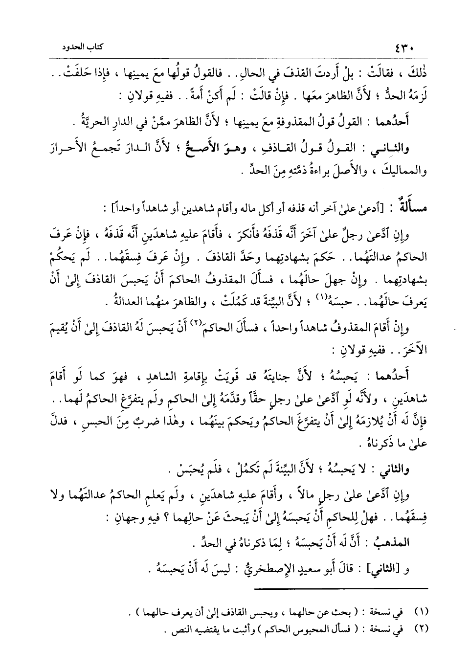 وإن ادعى رجل على آخر أنه قذفه فأنكر، فأقام عليه شاهدين أنه قذفه، فإن عرف الحاكم عدالتهما.. حكم بشهادتهما وحد القاذف وإن عرف فسقهما.. لم يحكم بشهادتهما. وإن جهل حالهما فسأل المقذوف الحاكم أن يحبس القاذف إلى أن يعرف حالهما.. حبسه لأن البينة قد كملت، والظاهر منهما العدالة.