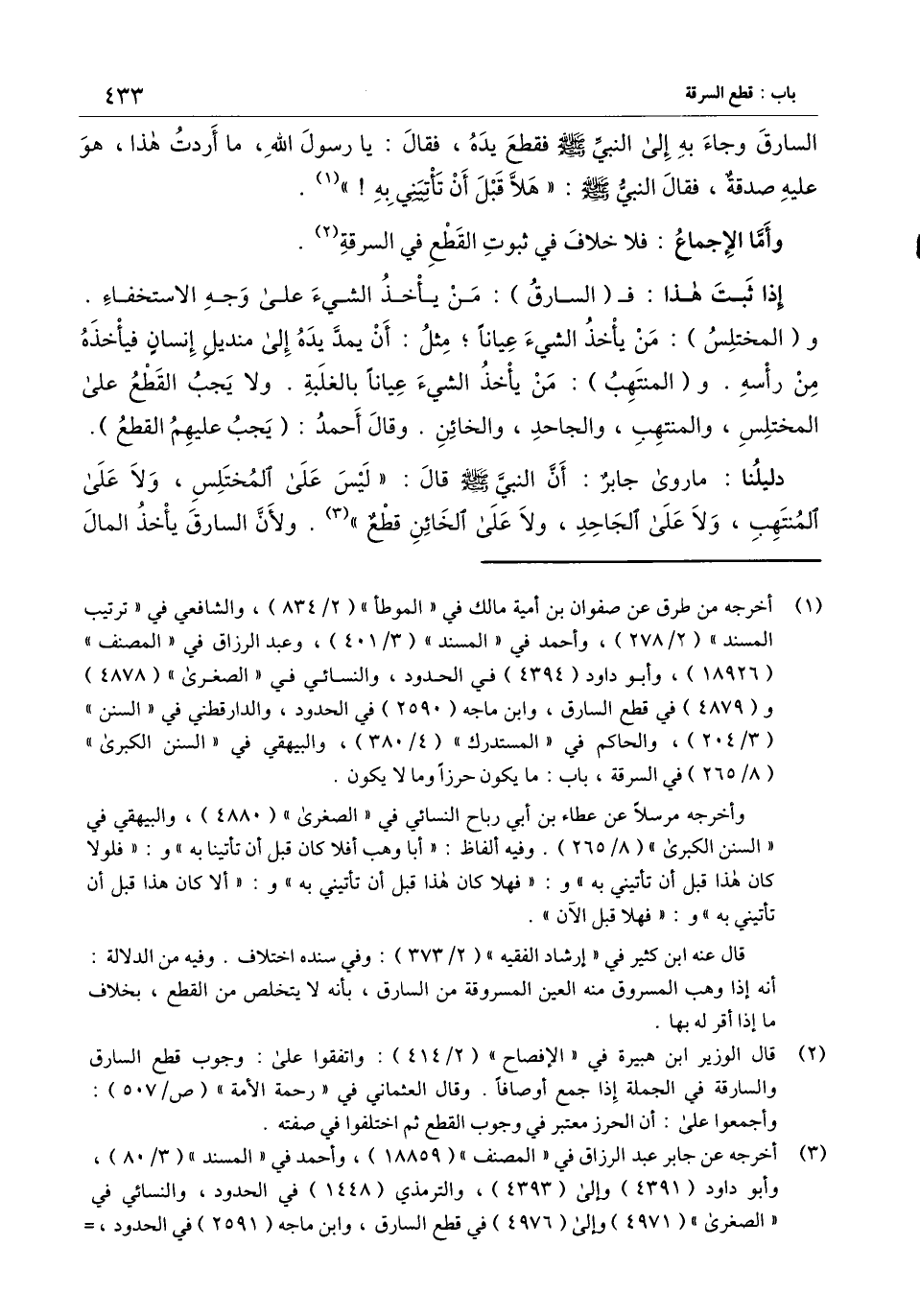 السارق وجاء به إلى النَّبيِّ - صَلَّى اللَّهُ عَلَيْهِ وَسَلَّمَ - "فقطع يده، فقال: يا رسول الله، ما أردت هذا، هو عليه صدقة، فقال النَّبيّ - صَلَّى اللَّهُ عَلَيْهِ وَسَلَّمَ -: "هلا قبل أن تأتينا به!»