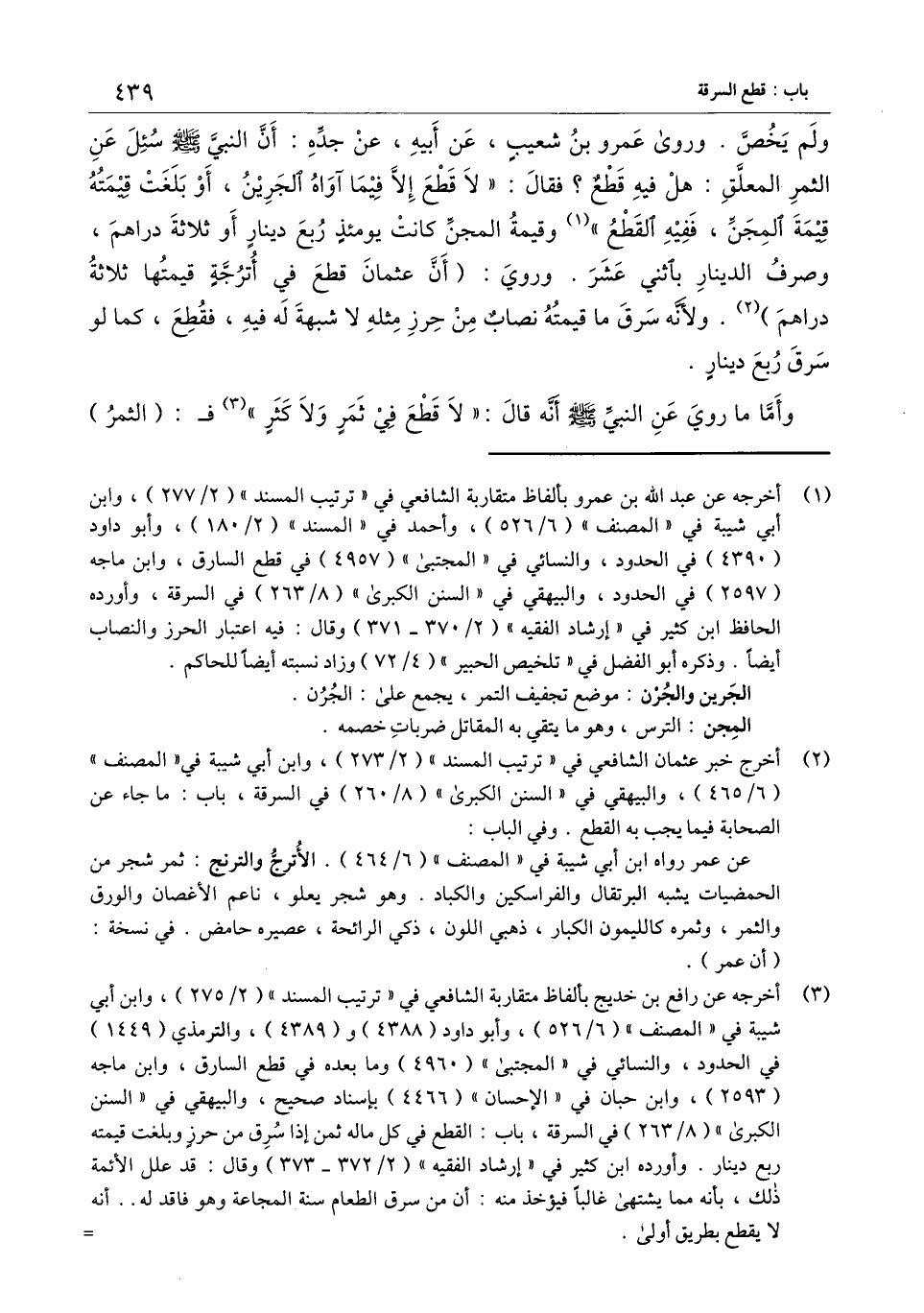 ولم يخص، «ورُوِى عمر بن شعيب عن أبيه، عن جده أن النَّبيَّ - صَلَّى اللَّهُ عَلَيْهِ وَسَلَّمَ - سئل عن الثمر المعلق؟ هل فيه قطع؟ فقال؟ "لا قطع إلا فيما آواه الجرين، أو بلغ قيمته قيمة المجن ففيه القطع» ، وقيمة المجن كانت يومئذ ربع دينار أو ثلاثة دراهم، وصرف الدينار باثني عشر. ورُوِي: (أن عُثمانَ قطع في أترجة قيمتها ثلاثة دراهم) ولأنه سرق ما قيمته نصاب من حرز مثله لا شبهة له فيه، فقطع، كما لو سرق ربع دينار.