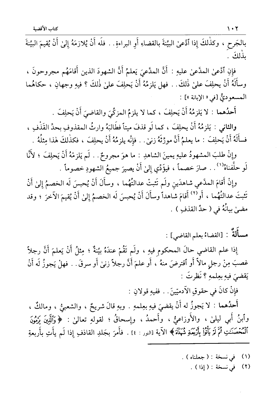 أحدهما: لا يجوز له أن يقضي فيه بعلمه.. وبه قال شريح، والشعبي، ومالك، وابن أبي ليلى، والأوزاعي، وأحمد، وإسحاق؛ لِقَوْلِهِ تَعَالَى: {وَالَّذِينَ يَرْمُونَ الْمُحْصَنَاتِ ثُمَّ لَمْ يَأْتُوا بِأَرْبَعَةِ شُهَدَاءَ} [النور: 4] الآية [النور: 4] . فأمر بجلد القاذف إذا لم يأت بأربعة