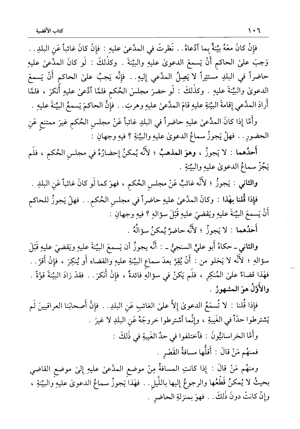 والثاني -حكاه أبو علي السنجي -: أنه يجوز أن يسمع البينة عليه ويقضي عليه قبل سؤاله؛ لأنه لا يخلو من: أن يقر بعد سماع البينة عليه والقضاء أو ينكر، فإن أقر.. فهذا قضاء على المنكر، فلم يكن في سؤاله فائدة، فإن أنكر.. فقد زاد البينة قوة. والأول هو المشهور. فإذا قلنا: لا تسمع الدعوى إلا على الغائب عن البلد.. فإن أصحابنا العراقيين لم يشترطوا حدا في الغيبة، وإنما اشترطوا خروجه عن البلد لا غير.