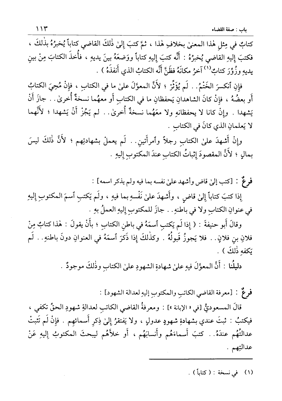 ] : إذا كتب كتابا إلى قاض، وأشهد على نفسه بما فيه، ولم يكتب اسم المكتوب إليه في عنوان الكتاب ولا في باطنه.. جاز للمكتوب إليه العمل به.