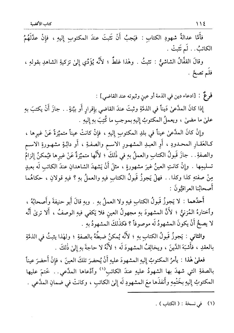 والثاني: يجوز قبول الكتاب به؛ لأنه يمكن ضبطه بالصفة؛ ولهذا يثبت في الذمة بالعقد، فأشبه الدين، ويخالف المشهود له؛ لأنه لا حاجة به إلى ذلك.