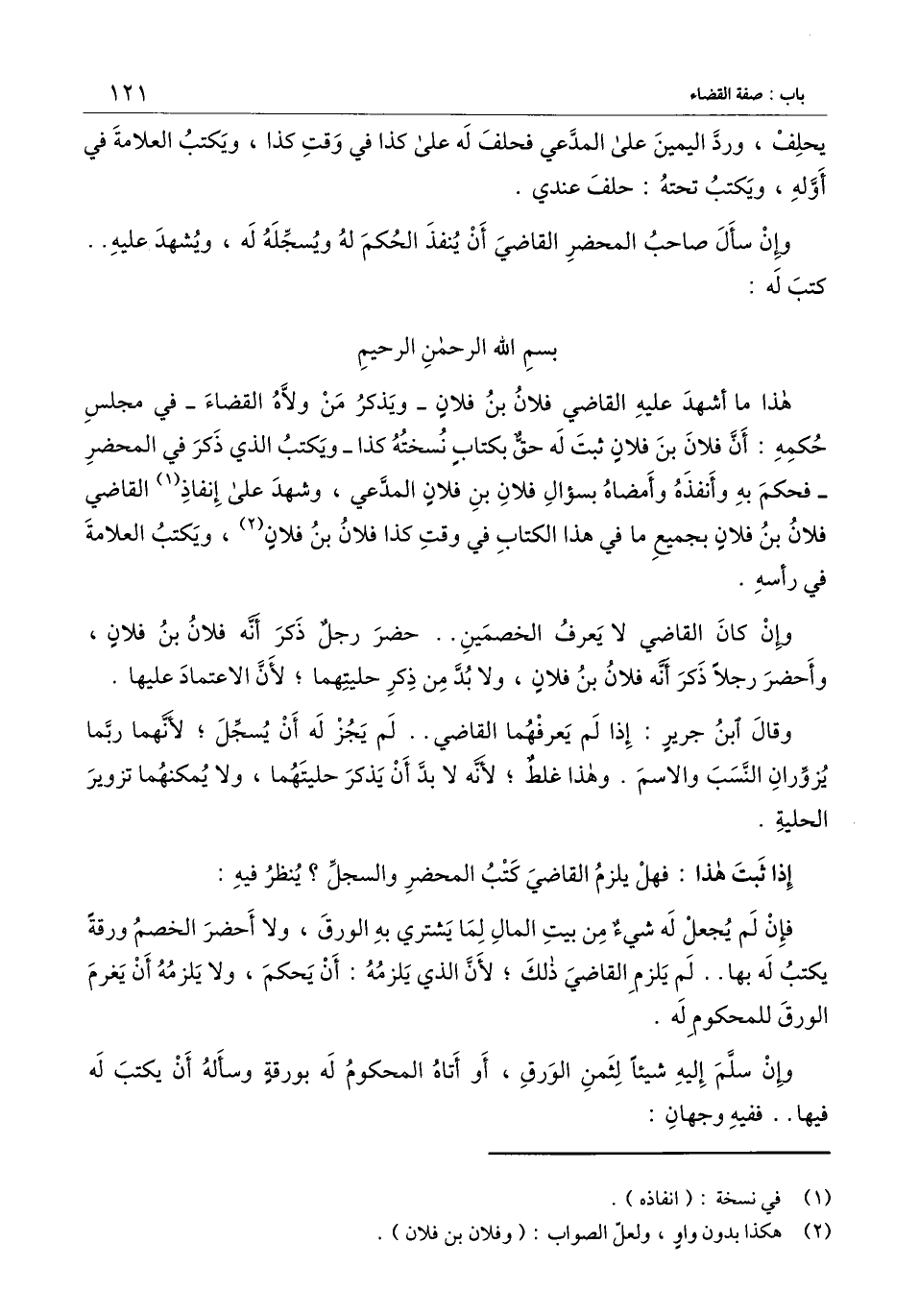 هذا ما أشهد عليه القاضي فلان بن فلان -ويذكر من ولاه القضاء - في مجلس حكمه: أن فلان بن فلان ثبت له حق بكتاب نسخته كذا -ويكتب الذي ذكر في المحضر - فحكم به وأنفذه وأمضاه بسؤال فلان بن فلان المدعي، وشهد على إنفاذ القاضي فلان بن فلان بجميع ما في هذا الكتاب في وقت كذا فلان بن فلان، ويكتب العلامة في رأسه.