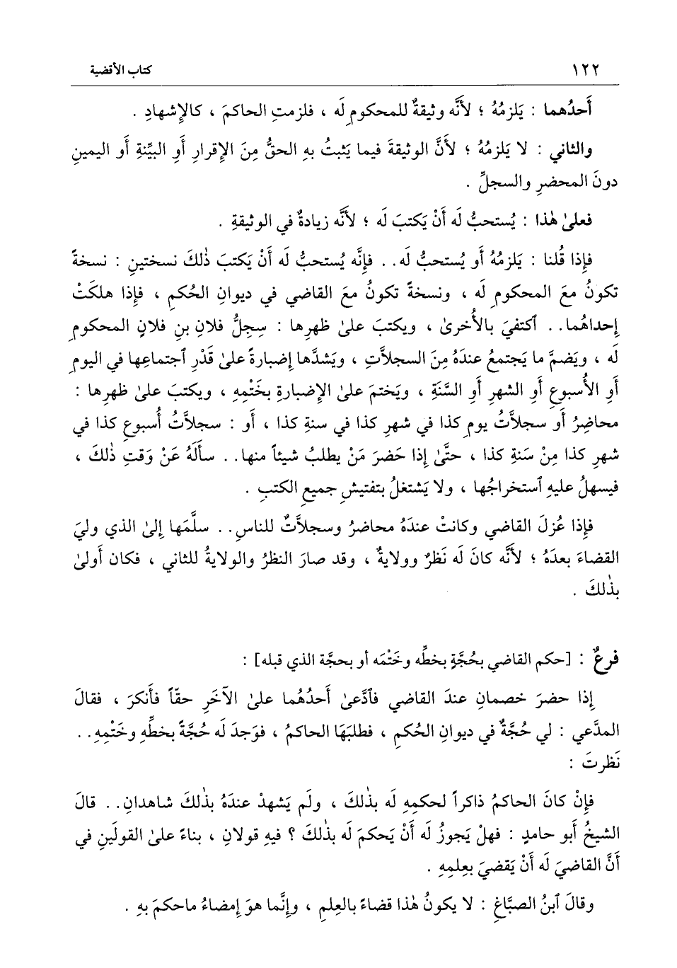 فإذا قلنا: يلزمه أو يستحب له.. فإنه يستحب له أن يكتب ذلك نسختين: نسخة تكون مع المحكوم له، ونسخة تكون مع القاضي في ديوان الحكم، فإذا هلكت إحداهما.. اكتفي بالأخرى، ويكتب على ظهرها: سجل فلان بن فلان المحكوم له، ويضم ما يجتمع عنده من السجلات، ويشدها إضبارة على قدر اجتماعها في اليوم أو الأسبوع أو الشهر أو السنة، ويختم على الإضبارة بختمه، ويكتب على ظهرها: محاضر أو سجلات يوم كذا في شهر كذا في سنة كذا، أو: سجلات أسبوع كذا في شهر كذا من سنة كذا، حتى إذا حضر من يطلب شيئا منها.. سأله عن وقت ذلك، فيسهل عليه استخراجها، ولا يشتغل بتفتيش جميع الكتب.