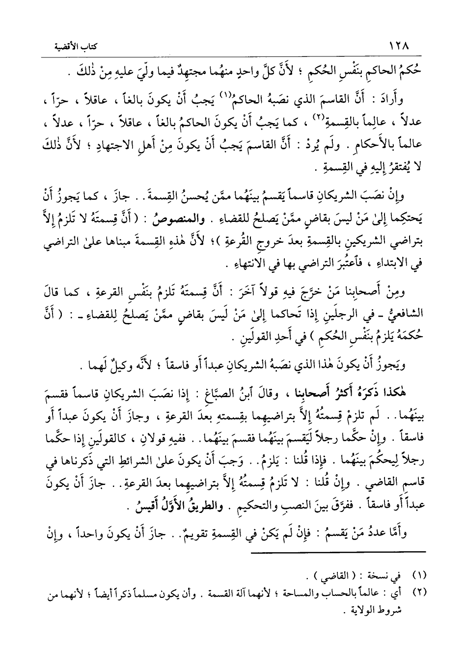 وأراد: أن القاسم الذي نصبه الحاكم يجب أن يكون بالغا، عاقلا، حرا، عدلا، عالما بالقسمة، كما يجب أن يكون الحاكم بالغا، عاقلا، حرا، عدلا، عالما بالأحكام. ولم يرد: أن القاسم يجب أن يكون من أهل الاجتهاد؛ لأن ذلك لا يفتقر إليه في القسمة.