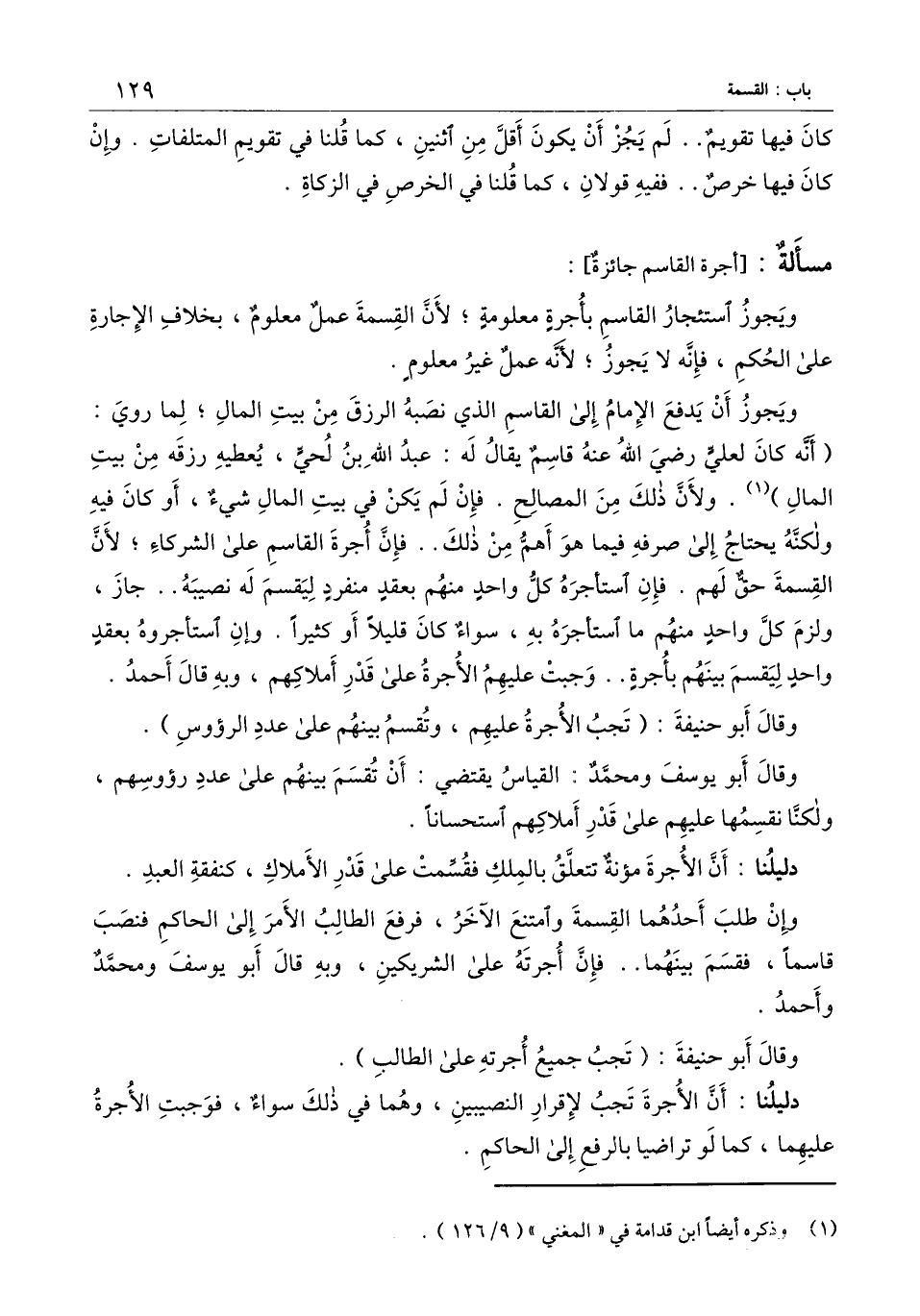 ويجوز استئجار القاسم بأجرة معلومة؛ لأن القسمة عمل معلوم، بخلاف الإجارة على الحكم، فإنه لا يجوز؛ لأنه عمل غير معلوم.