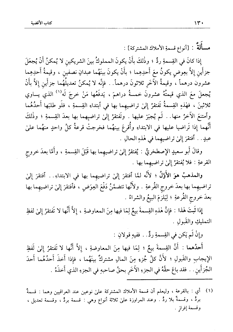 إذا كان في القسمة رد؛ وذلك بأن يكون المملوك بين الشريكين لا يمكن أن يجعل جزأين إلا بعوض يكون مع أحدهما؛ بأن يكون بينهما عبدان نصفين، وقيمة أحدهما عشرون درهما، وقيمة الآخر ثلاثون درهما.. فإنه لا يمكن تعديلهما جزأين إلا بأن يجعل مع الذي قيمته عشرون خمسة دراهم، يدفعها من خرج له الذي يساوي ثلاثين، فهذه القسمة تفتقر إلى تراضيهما بها في ابتداء القسمة، فلو طلبها أحدهما وامتنع الآخر منها.. لم يجبر عليها. وتفتقر إلى تراضيهما بها بعد القسمة؛ وذلك أنهما إذا تراضيا عليها في الابتداء وأقرع بينهما فخرجت قرعة كل واحد منهما على عبد.. افتقر إلى تراضيهما في هذه الحال.