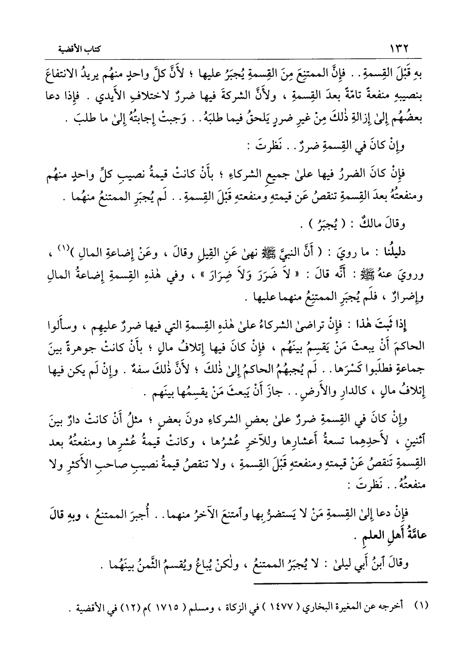 به قبل القسمة.. فإن الممتنع من القسمة يجبر عليها؛ لأن كل واحد منهم يريد الانتفاع بنصيبه منفعة تامة بعد القسمة، ولأن الشركة فيها ضرر لاختلاف الأيدي. فإذا دعا بعضهم إلى إزالة ذلك من غير ضرر يلحق فيما طلبه.. وجبت إجابته إلى ما طلب.