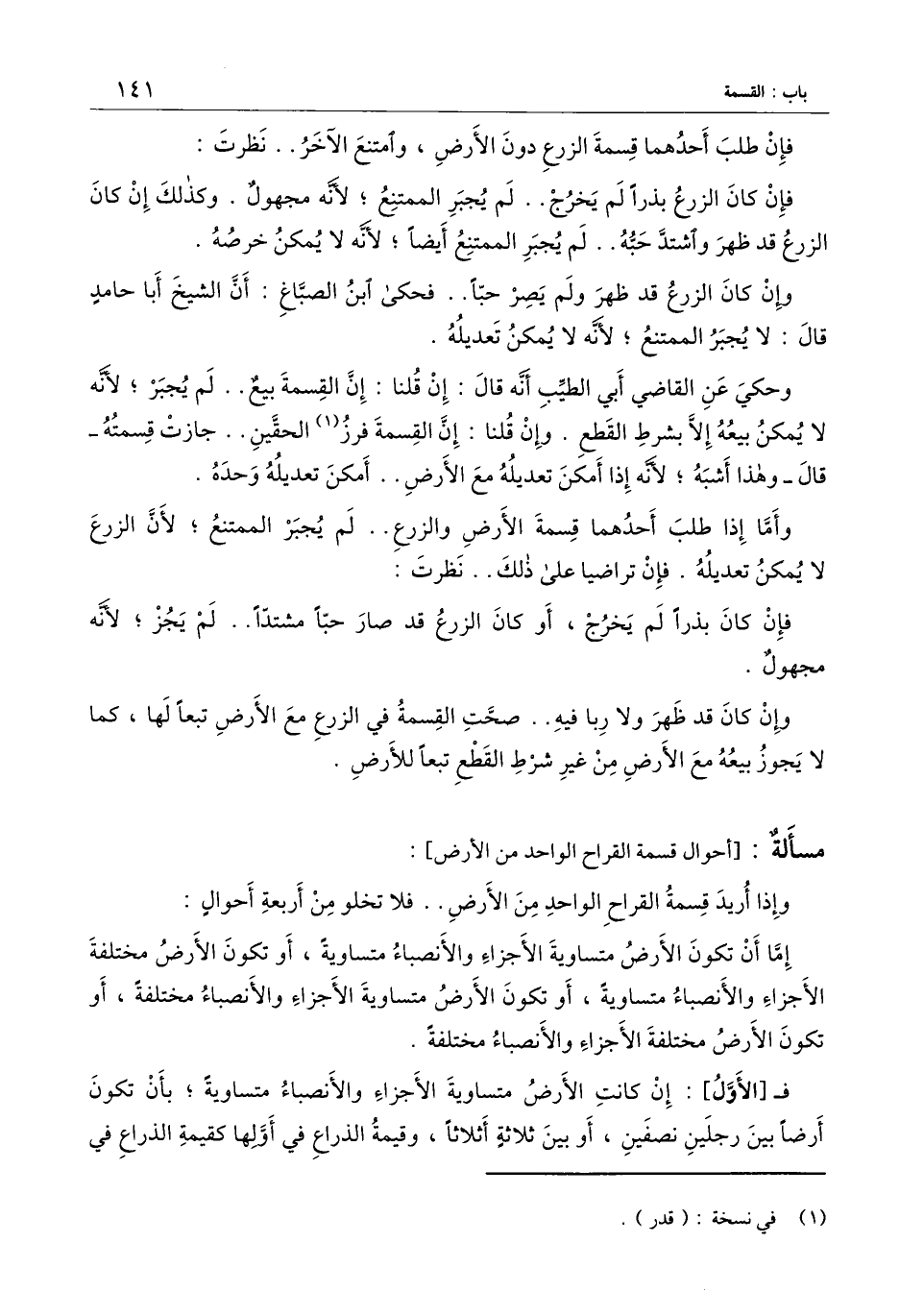 وإذا أريد قسمة القراح الواحد من الأرض.. فلا تخلو من أربعة أحوال: