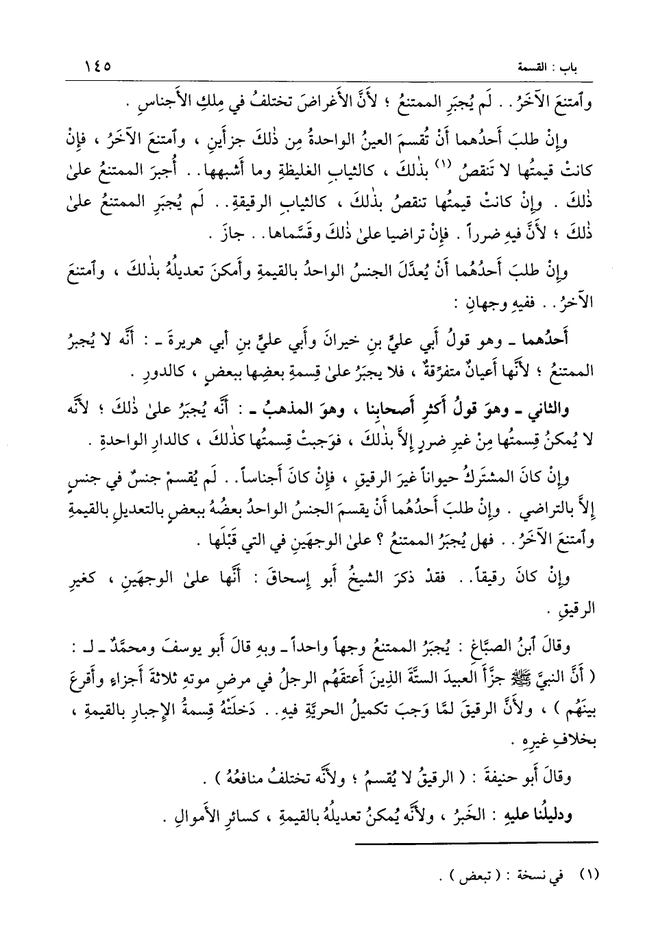 وقال ابن الصباغ: يجبر الممتنع وجها واحدا - وبه قال أبو يوسف ومحمد - لـ: (أن النبي - صَلَّى اللَّهُ عَلَيْهِ وَسَلَّمَ - «جزأ العيد الستة الذين أعتقهم الرجل في مرض موته ثلاثة أجزاء وأقرع بينهم» ، ولأن الرقيق لما وجب تكميل الحرية فيه.. دخلته قسمة الإجبار بالقيمة، بخلاف غيره.