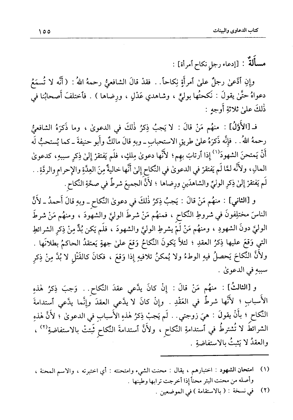 و [الثاني] : منهم من قال: يجب ذكر ذلك في دعوى النكاح - وبه قال أحمد - لأن الناس مختلفون في شروط النكاح، فمنهم من شرط الولي والشهود، ومنهم من شرط الولي دون الشهود، ومنهم من لم يشرط الولي والشهود، فلم يكن بد من ذكر الشرائط التي وقع عليها ذكر العقد؛ لئلا يكون النكاح وقع على جهة يعتقد الحاكم بطلانها. ولأن النكاح يحصل فيه الوطء ولا يمكن تلافيه إذا وقع، فكان كالقتل لا بد من ذكر سببه في الدعوى.