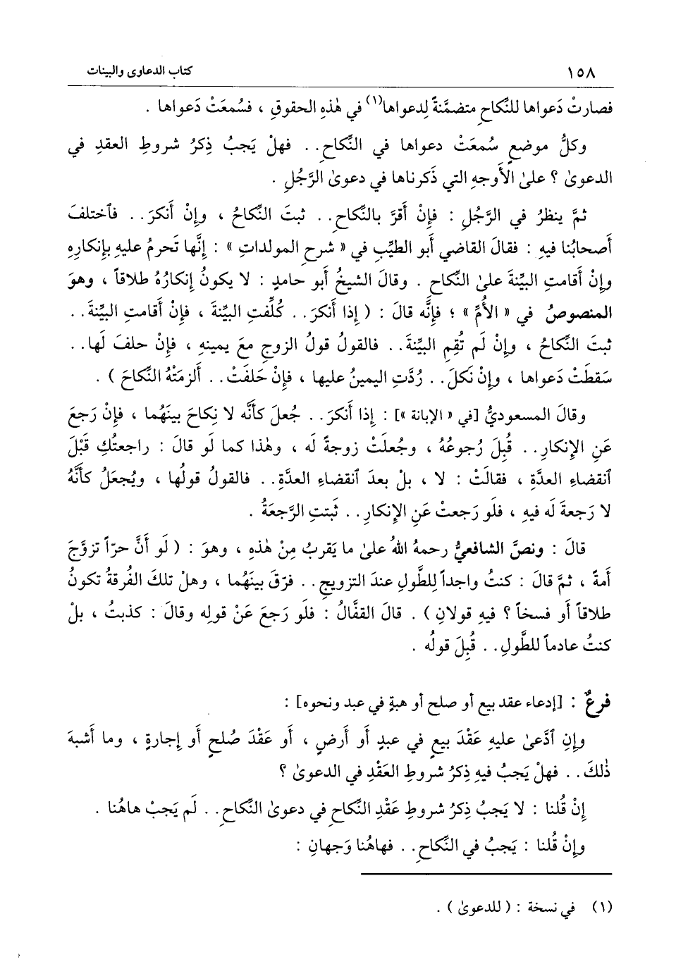 قال: ونص الشافعي - رَحِمَهُ اللَّهُ - على ما يقرب من هذه، وهو: (لو أن حرا تزوج أمة، ثم قال: كنت واجدا للطول عند التزويج.. فرق بينهما، وهل تلك الفرقة تكون طلاقا أو فسخا؟ فيه قولان) . قال القفال: فلو رجع عن قوله وقال: كذبت، بل كنت عادما للطول.. قبل قوله.