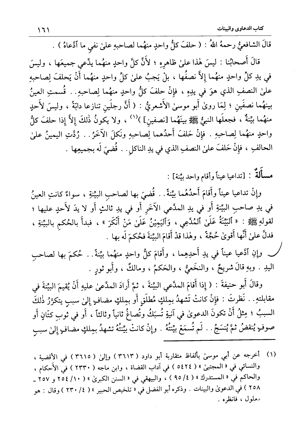 قال أصحابنا: ليس هذا على ظاهره؛ لأن كل واحد منهما يدعي جميعها، وليس في يد كل واحد منهما إلا نصفها، بل يجب على كل واحد منهما أن يحلف لصاحبه على النصف الذي هو في يده، فإن حلف كل واحد منهما لصاحبه.. قسمت العين بينهما نصفين؛ لما روى أبو موسى الأشعري: «أن رجلين تنازعا دابة، وليس لأحد منهما بينة، فجعلها النبي - صَلَّى اللَّهُ عَلَيْهِ وَسَلَّمَ - بينهما [نصفين] » ، ولا يكون ذلك إلا إذا حلف كل واحد منهما لصاحبه. فإن حلف أحدهما لصاحبه ونكل الآخر.. ردت اليمين على الحالف، فإن حلف على النصف الذي في يد الناكل.. قضي له بجميعها.