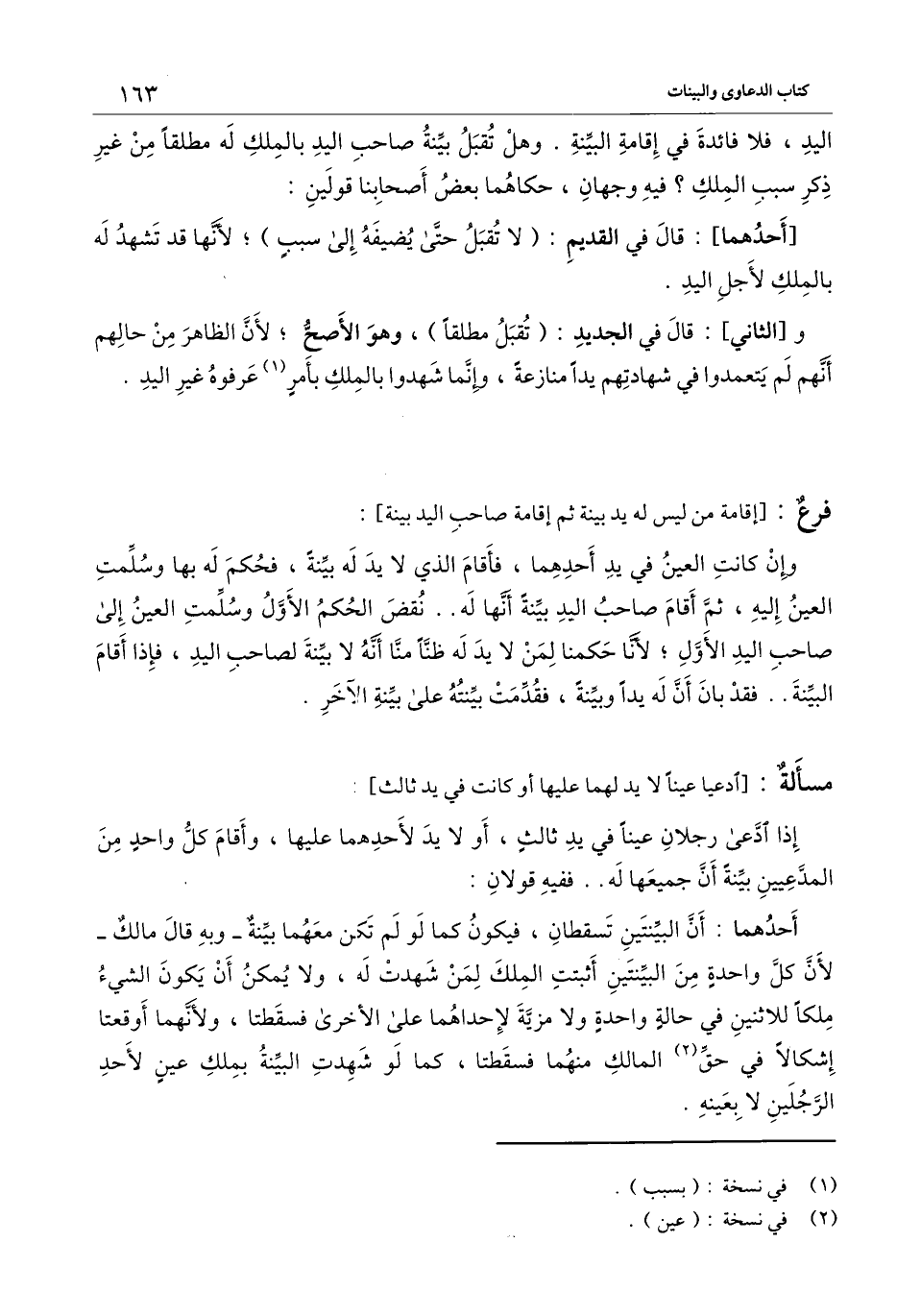 اليد، فلا فائدة في إقامة البينة. وهل تقبل بينة صاحب اليد بالملك له مطلقا من غير ذكر سبب الملك؟ فيه وجهان، حكاهما بعض أصحابنا قولين: