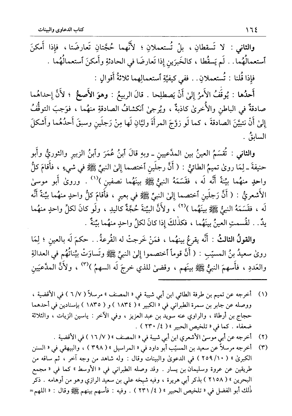 والثاني: تقسم العين بين المدعيين - وبه قال ابن عمر وابن الزبير والثوري وأبو حنيفة - لما روى تميم الطائي: «أن رجلين اختصما إلى النبي - صَلَّى اللَّهُ عَلَيْهِ وَسَلَّمَ - في شيء، فأقام كل واحد منهما بينة أنه له، فقسمه النبي - صَلَّى اللَّهُ عَلَيْهِ وَسَلَّمَ - بينهما نصفين» . وروى أبو موسى الأشعري: «أن رجلين اختصما إلى النبي - صَلَّى اللَّهُ عَلَيْهِ وَسَلَّمَ - في بعير، فأقام كل واحد منهما بينة أنه له، فقسمه النبي - صَلَّى اللَّهُ عَلَيْهِ وَسَلَّمَ - بينهما» ، ولأن البينة حجة كاليد، ولو كان لكل واحد منهما يد.. لقسمت العين بينهما، فكذلك إذا كان لكل واحد منهما بينة.