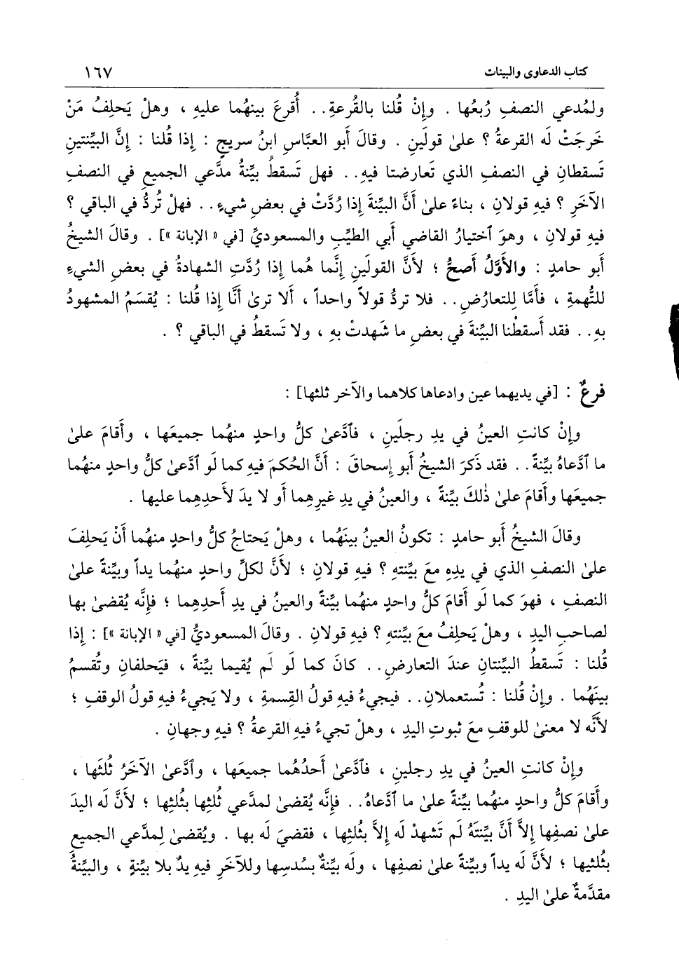 ولمدعي النصف ربعها. وإن قلنا بالقرعة.. أقرع بينهما عليه، وهل يحلف من خرجت له القرعة؟ على قولين. وقال أبو العباس بن سريج: إذا قلنا: إن البينتين تسقطان في النصف الذي تعارضتا فيه.. فهل تسقط بينة مدعي الجميع في النصف الآخر؟ فيه قولان، بناء على أن البينة إذا ردت في بعض شيء.. فهل ترد في الباقي؟ فيه قولان، وهو اختيار القاضي أبي الطيب والمسعودي [في " الإبانة "] . وقال الشيخ أبو حامد: والأول أصح؛ لأن القولين إنما هما إذا ردت الشهادة في بعض الشيء للتهمة، فأما للتعارض.. فلا ترد قولا واحدا، ألا ترى أنا إذا قلنا: يقسم المشهود به.. فقد أسقطنا البينة في بعض ما شهدت به، ولا تسقط في الباقي؟.