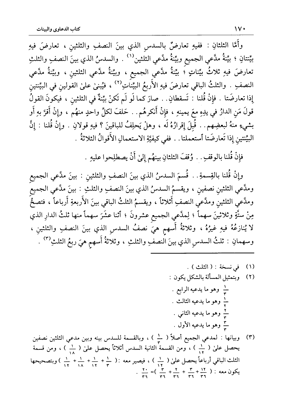 وإن قلنا بالقسمة.. قسم السدس الذي بين النصف والثلثين: بين مدعي الجميع ومدعي الثلثين نصفين، ويقسم السدس الذي بين النصف والثلث: بين مدعي الجميع ومدعي الثلثين ومدعي النصف أثلاثا، ويقسم الثلث الباقي بين الأربعة أرباعا، فتصح من ستة وثلاثين سهما؛ لمدعي الجميع عشرون؛ اثنا عشر سهما منها ثلث الدار الذي لا ينازعه فيه غيره، وثلاثة أسهم هي نصف السدس الذي بين النصف والثلثين، وسهمان: ثلث السدس الذي بين النصف والثلث، وثلاثة أسهم هي ربع الثلث.