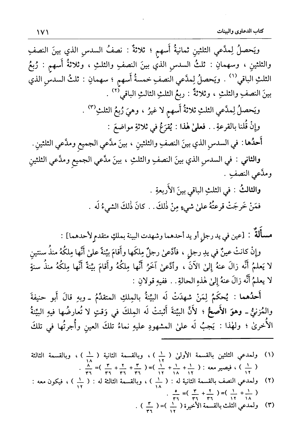 ويحصل لمدعي الثلثين ثمانية أسهم؛ ثلاثة: نصف السدس الذي بين النصف والثلثين، وسهمان: ثلث السدس الذي بين النصف والثلث، وثلاثة أسهم: ربع الثلث الباقي. ويحصل لمدعي النصف خمسة أسهم؛ سهمان: ثلث السدس الذي بين النصف والثلث، وثلاثة: ربع الثلث الثالث الباقي.