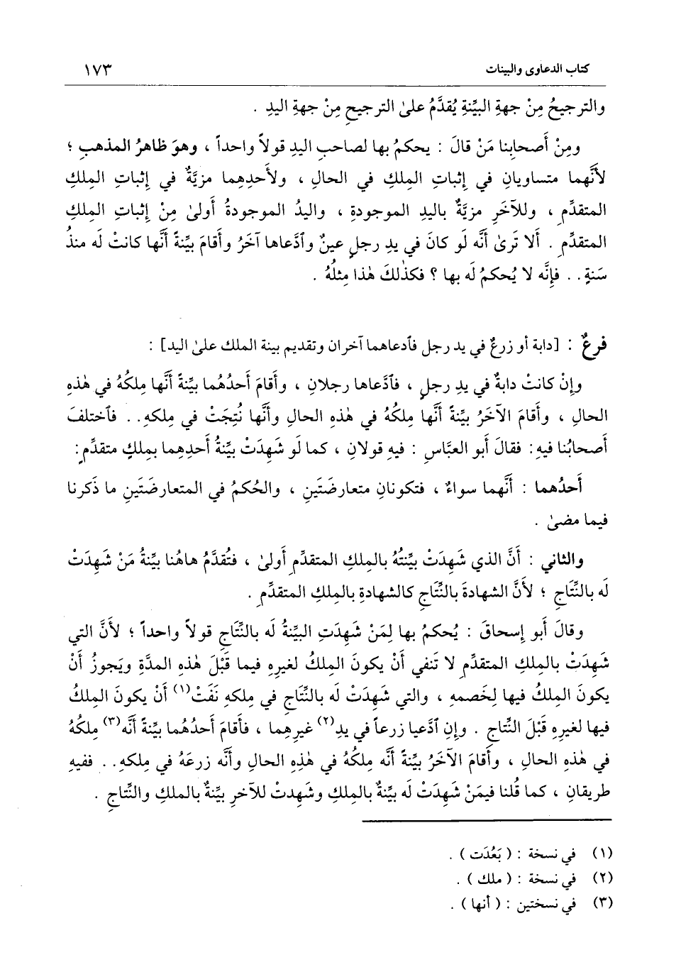 [فرع دابة أو زرع في يد رجل فادعاهما آخران وتقديم بينة الملك على اليد]