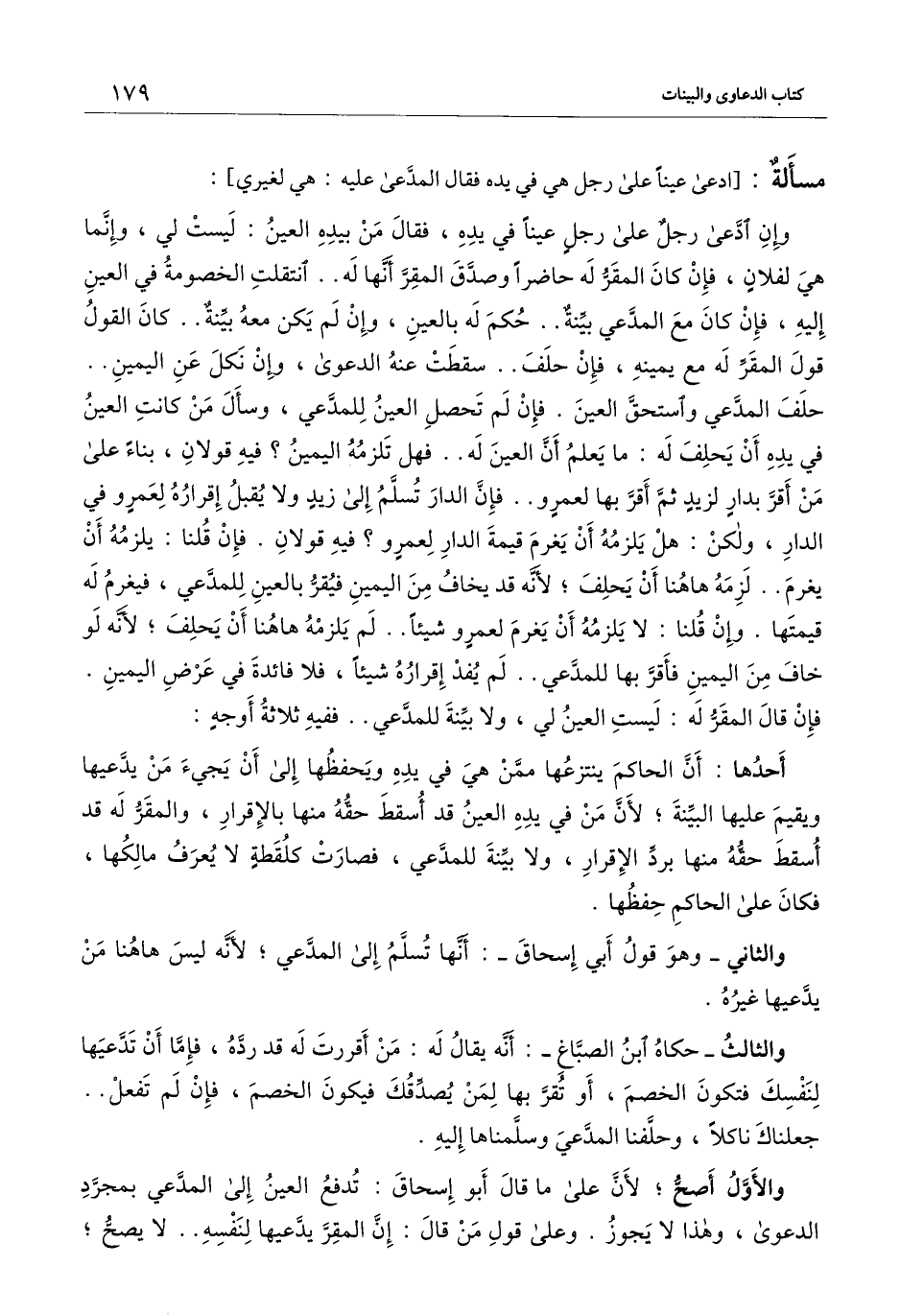 وإن ادعى رجل على رجل عينا في يده، فقال من بيده العين: ليست لي، وإنما هي لفلان، فإن كان المقر له حاضرا وصدق المقر أنها له.. انتقلت الخصومة في العين إليه، فإن كان مع المدعي بينة.. حكم له بالعين، وإن لم يكن معه بينة.. كان القول قول المقر له مع يمينه، فإن حلف.. سقطت عنه الدعوى، وإن نكل عن اليمين.. حلف المدعي واستحق العين. فإن لم تحصل العين للمدعي، وسأل من كانت العين في يده أن يحلف له: ما يعلم أن العين له.. فهل تلزمه اليمين؟ فيه قولان، بناء على من أقر بدار لزيد ثم أقر بها لعمرو.. فإن الدار تسلم إلى زيد ولا يقبل إقراره لعمرو في الدار، ولكن: هل يلزمه أن يغرم قيمة الدار لعمرو؟ فيه قولان. فإن قلنا: يلزمه أن يغرم.. لزمه هاهنا أن يحلف؛ لأنه قد يخاف من اليمين فيقر بالعين للمدعي، فيغرم له قيمتها. وإن قلنا: لا يلزمه أن يغرم لعمرو شيئا.. لم يلزمه هاهنا أن يحلف؛ لأنه لو خاف من اليمين فأقر بها للمدعي.. لم يفد إقراره شيئا، فلا فائدة في عرض اليمين. فإن قال المقر له: ليست العين لي، ولا بينة للمدعي.. ففيه ثلاثة أوجه: