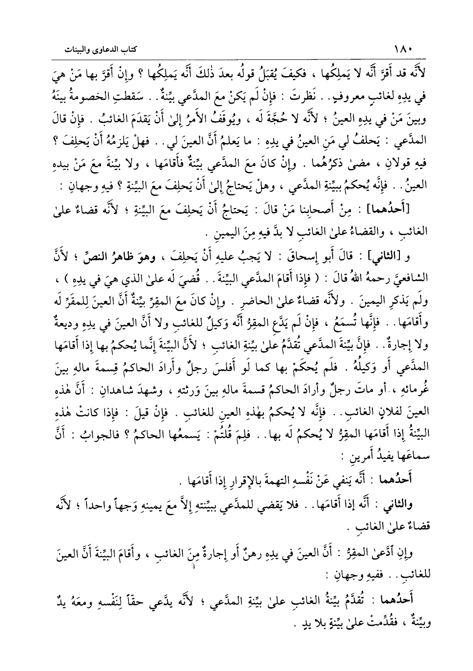 و [الثاني] : قال أبو إسحاق: لا يجب عليه أن يحلف، وهو ظاهر النص؛ لأن الشافعي - رَحِمَهُ اللَّهُ - قال: (فإذا أقام المدعي البينة.. قضي له على الذي هي في يده) ، ولم يذكر اليمين. ولأنه قضاء على الحاضر. وإن كان مع المقر بينة أن العين للمقر له وأقامها.. فإنها تسمع، فإن لم يدع المقر أنه وكيل للغائب ولا أن العين في يده وديعة ولا إجارة.. فإن بينة المدعي تقدم على بينة الغائب؛ لأن البينة إنما يحكم بها إذا أقامها المدعي أو وكيله. فلم يحكم بها كما لو أفلس رجل وأراد الحاكم قسمة ماله بين غرمائه، أو مات رجل وأراد الحاكم قسمة ماله بين ورثته، وشهد شاهدان: أن هذه العين لفلان الغائب.. فإنه لا يحكم بهذه العين للغائب. فإن قيل: فإذا كانت هذه البينة إذا أقامها المقر لا يحكم له بها.. فلم قلتم: يسمعها الحاكم؟ فالجواب: أن سماعها يفيد أمرين: