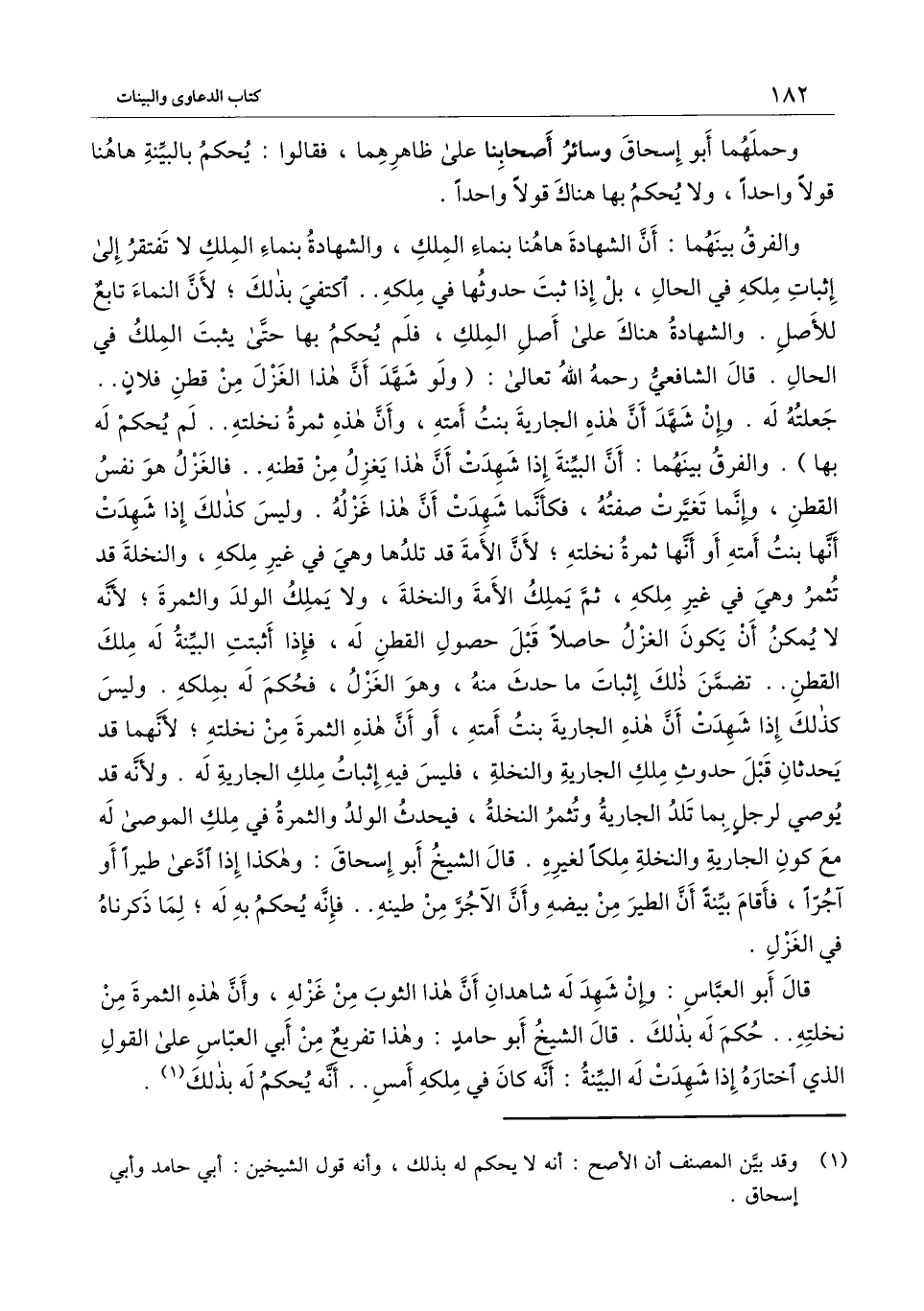والفرق بينهما: أن الشهادة هاهنا بنماء الملك، والشهادة بنماء الملك لا تفتقر إلى إثبات ملكه في الحال، بل إذا ثبت حدوثها في ملكه.. اكتفى بذلك؛ لأن النماء تابع للأصل. والشهادة هناك على أصل الملك، فلم يحكم بها حتى يثبت الملك في الحال. قال الشافعي - رَحِمَهُ اللَّهُ تَعَالَى -: (ولو شهد أن هذا الغزل من قطن فلان.. جعلته له. وإن شهد أن هذه الجارية بنت أمته، وأن هذه ثمرة نخلته.. لم يحكم له بها) . والفرق بينهما: أن البينة إذا شهدت أن هذا يغزل من قطنه.. فالغزل هو نفس القطن، وإنما تغيرت صفته، فكأنما شهدت أن هذا غزله. وليس كذلك إذا شهدت أنها بنت أمته أو أنها ثمرة نخلته؛ لأن الأمة قد تلدها وهي في غير ملكه، والنخلة قد تثمر وهي في غير ملكه، ثم يملك الأمة والنخلة، ولا يملك الولد والثمرة؛ لأنه لا يمكن أن يكون الغزل حاصلا قبل حصول القطن له، فإذا أثبتت البينة له ملك القطن.. تضمن ذلك إثبات ما حدث منه، وهو الغزل، فحكم له بملكه. وليس كذلك إذا شهدت أن هذه الجارية بنت أمته، أو أن هذه الثمرة من نخلته؛ لأنهما قد يحدثان قبل حدوث ملك الجارية والنخلة، فليس فيه إثبات ملك الجارية له. ولأنه قد يوصي لرجل بما تلد الجارية وتثمر النخلة، فيحدث الولد والثمرة في ملك الموصى له مع كون الجارية والنخلة ملكا لغيره. قال الشيخ أبو إسحاق: وهكذا إذا ادعى طيرا أو آجرا، فأقام بينة أن الطير من بيضه وأن الآجر من طينه.. فإنه يحكم به له؛ لما ذكرناه في الغزل.