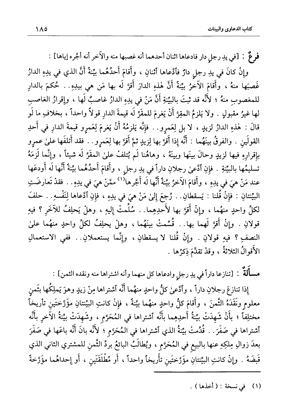 إذا تنازع رجلان دارا، وادعى كل واحد منهما أنه اشتراها من زيد وهو يملكها بثمن معلوم ونقده الثمن، وأقام كل واحد منهما بينة، فإن كانت البينتان مؤرختين تأريخا مختلفا؛ بأن شهدت بينة أحدهما بأنه اشتراها في المحرم، وشهدت بينة الآخر بأنه اشتراها في صفر.. قدمت بينة الذي اشتراها في المحرم؛ لأنه بان أنه باعها في صفر بعد زوال ملكه عنها بالبيع في المحرم، ويطالب البائع برد الثمن للمشتري الثاني الذي قبضه. وإن كانت البينتان مؤرختين تأريخا واحدا، أو مطلقتين، أو إحداهما مؤرخة