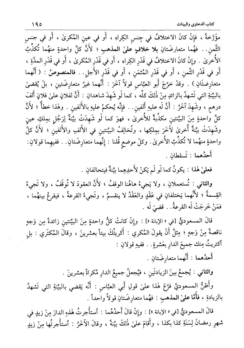 مؤرخة، فإن كان الاختلاف في جنس الكراء، أو في عين المكرى، أو في جنس الثمن.. فهما متعارضتان بلا خلاف على المذهب؛ لأن كل واحدة منهما تكذب الأخرى. وإن كان الاختلاف في قدر الكراء، أو في قدر المكرى، أو في قدر المدة، أو في قدر الثمن، أو في قدر المثمن، أو في قدر الأجل.. فالمنصوص: (أنهما متعارضتان) . وقد خرج أبو العباس قولا آخر: أنهما غير متعارضتين، بل يقضى بالبينة التي تشهد بالزائد من ذلك كله، كما لو شهد شاهدان: أن لفلان على فلان ألف درهم، وشهد آخر: أن له عليه ألفين.. فإنه يحكم عليه بالألفين. وهذا خطأ؛ لأن كل واحدة من البينتين مكذبة للأخرى، فهو كما لو شهدت بينة لرجل بملك عين وشهدت بينة أخرى لآخر بملكها، وتخالف البينتين في الألف والألفين؛ لأن كل واحدة منهما لا تكذب الأخرى. وكل موضع قلنا: إنهما متعارضتان.. ففيهما قولان: