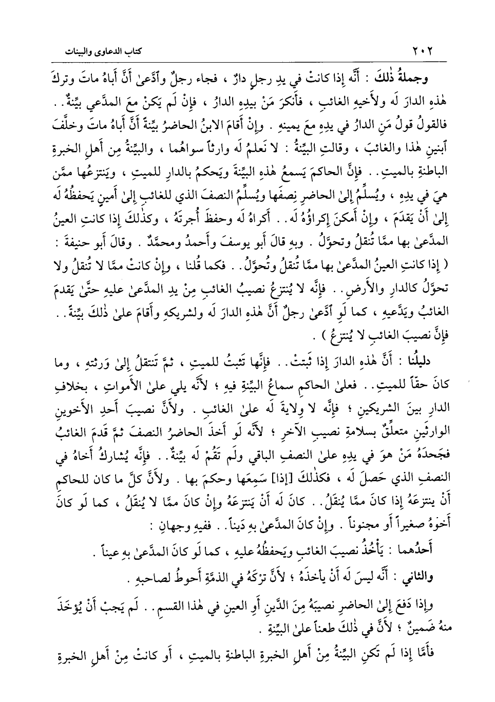 وجملة ذلك: أنه إذا كانت في يد رجل دار، فجاء رجل وادعى أن أباه مات وترك هذه الدار له ولأخيه الغائب، فأنكر من بيده الدار، فإن لم يكن مع المدعي بينة.. فالقول قول من الدار في يده مع يمينه. وإن أقام الابن الحاضر بينة أن أباه مات وخلف ابنين هذا والغائب، وقالت البينة: لا نعلم له وارثا سواهما، والبينة من أهل الخبرة الباطنة بالميت.. فإن الحاكم يسمع هذه البينة ويحكم بالدار للميت، وينتزعها ممن هي في يده، ويسلم إلى الحاضر نصفها ويسلم النصف الذي للغائب إلى أمين يحفظه له إلى أن يقدم، وإن أمكن إكراؤه له.. أكراه له وحفظ أجرته، وكذلك إذا كانت العين المدعى بها مما تنقل وتحول.. وبه قال أبو يوسف وأحمد ومحمد. وقال أبو حنيفة: (إذا كانت العين المدعى بها مما تنقل وتحول.. فكما قلنا، وإن كانت مما لا تنقل ولا تحول كالدار والأرض.. فإنه لا ينتزع نصيب الغائب من يد المدعى عليه حتى يقدم الغائب ويدعيه، كما لو ادعى رجل أن هذه الدار له ولشريكه وأقام على ذلك بينة.. فإن نصيب الغائب لا ينتزع) .