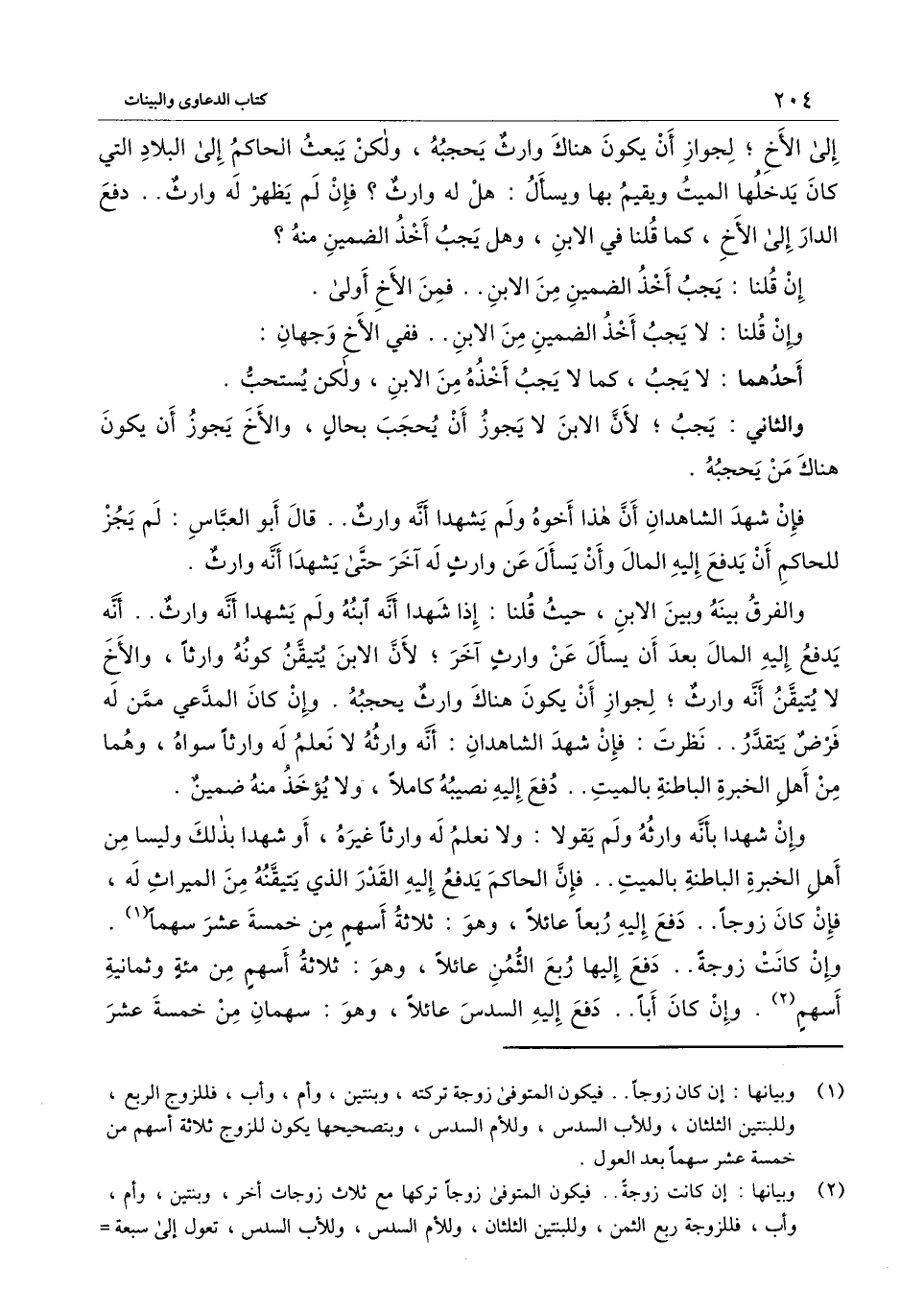 والفرق بينه وبين الابن، حيث قلنا: إذا شهد أنه ابنه ولم يشهدا أنه وارث.. أنه يدفع إليه المال بعد أن يسأل عن وارث آخر؛ لأن الابن يتيقن كونه وارثا، والأخ لا يتيقن أنه وارث؛ لجواز أن يكون هناك وارث يحجبه. وإن كان المدعي ممن له فرض يتقدر.. نظرت: فإن شهد الشاهدان: أنه وارثه لا نعلم له وارثا سواه، وهما من أهل الخبرة الباطنة بالميت.. دفع إليه نصيبه كاملا، ولا يؤخذ منه ضمين.