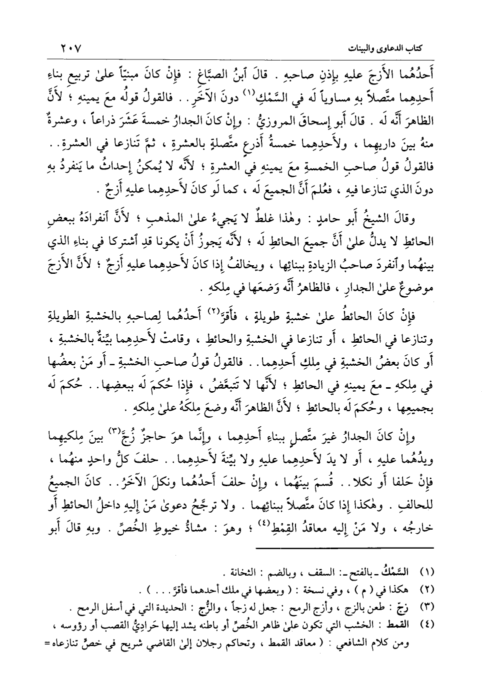 وقال الشيخ أبو حامد: وهذا غلط لا يجيء على المذهب؛ لأن انفراده ببعض الحائط لا يدل على أن جميع الحائط له؛ لأنه يجوز أن يكونا قد اشتركا في بناء الذي بينهما وانفرد صاحب الزيادة ببنائها، ويخالف إذا كان لأحدهما عليه أزج؛ لأن الأزج موضوع على الجدار، فالظاهر أنه وضعها في ملكه.