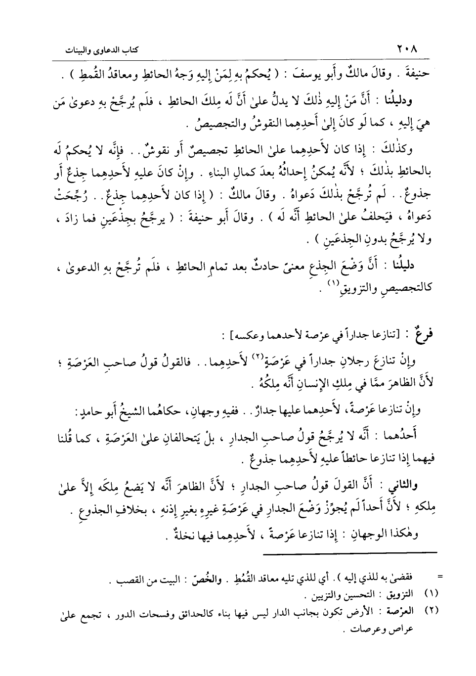 وكذلك: إذا كان لأحدهما على الحائط تجصيص أو نقوش.. فإنه لا يحكم له بالحائط بذلك؛ لأنه يمكن إحداثه بعد كمال البناء. وإن كان عليه لأحدهما جذع أو جذوع.. لم ترجح بذلك دعواه. وقال مالك: (إذا كان لأحدهما جذع.. رجحت دعواه، فيحلف على الحائط أنه له) . وقال أبو حنيفة: (يرجح بجذعين فما زاد، ولا يرجح بدون الجذعين) .