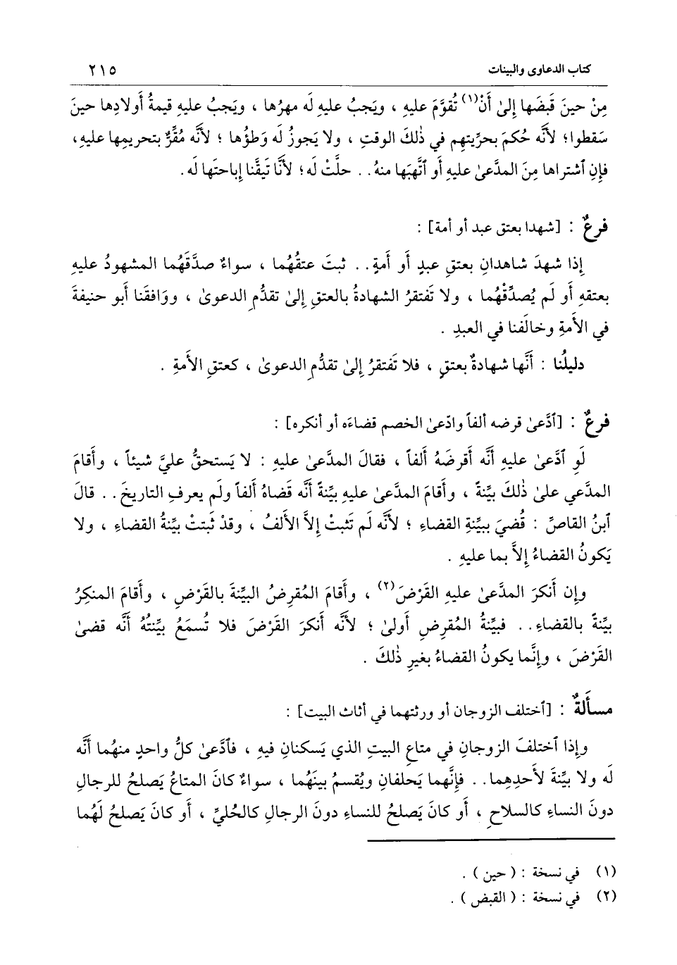 إذا شهد شاهدان بعتق عبد أو أمة.. ثبت عتقهما، سواء صدقهما المشهود عليه بعتقه أو لم يصدقهما، ولا تفتقر الشهادة بالعتق إلى تقدم الدعوى، ووافقنا أبو حنيفة في الأمة وخالفنا في العبد.