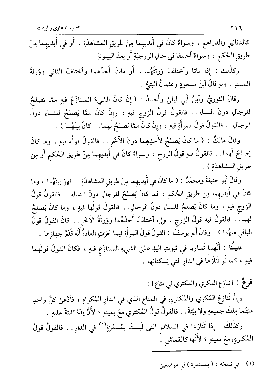 وقال الثوري وابن أبي ليلى وأحمد: (إن كان الشيء المتنازع فيه مما يصلح للرجال دون النساء.. فالقول قول الزوج فيه، وإن كان مما يصلح للنساء دون الرجال.. فالقول قول المرأة فيه، وإن كان مما يصلح لهما.. كان بينهما) .